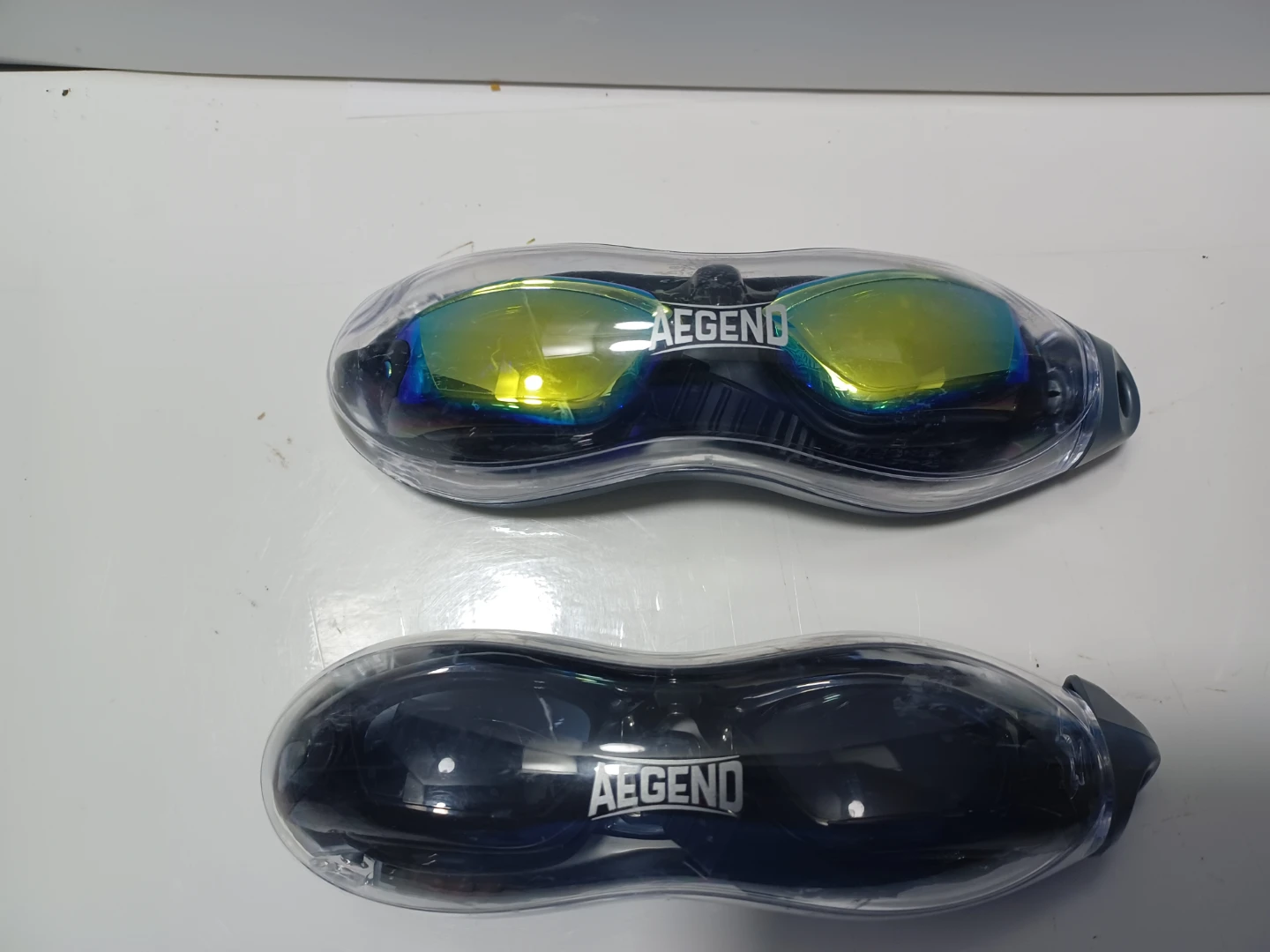 Selling two pairs of Aegend swim goggles! One pair features a mirrored lens, and the other has a dark lens. Both come with their original cases.