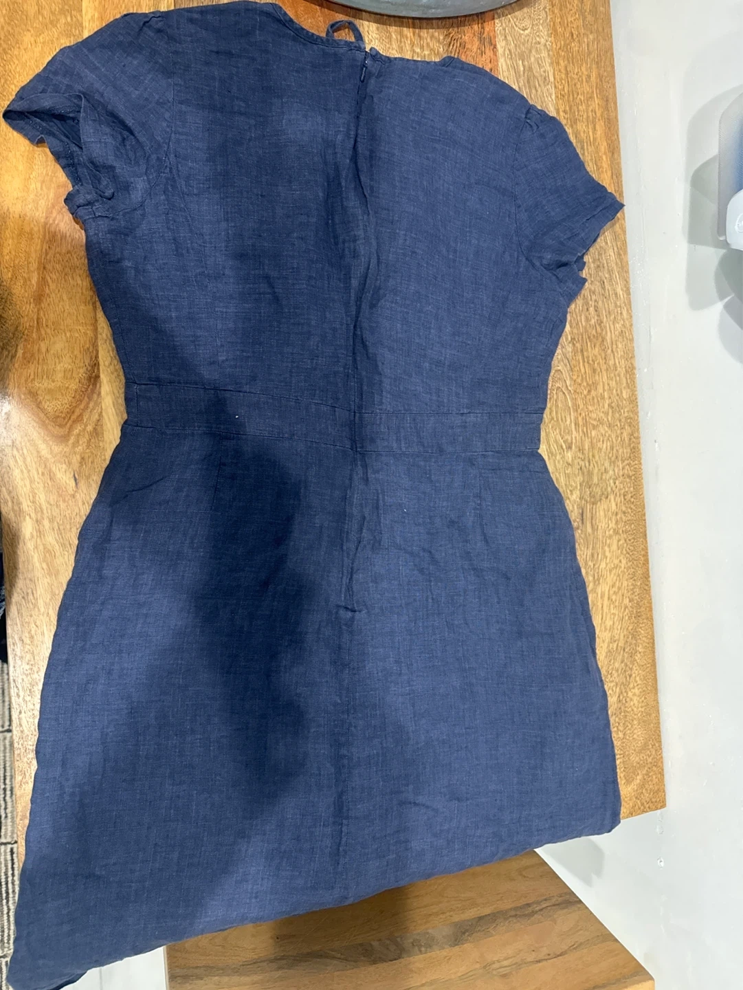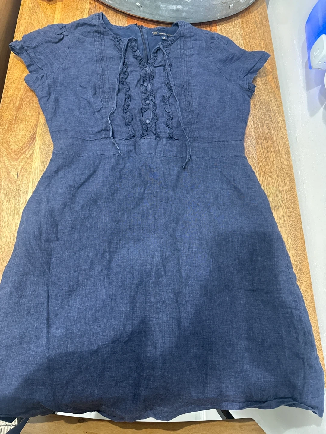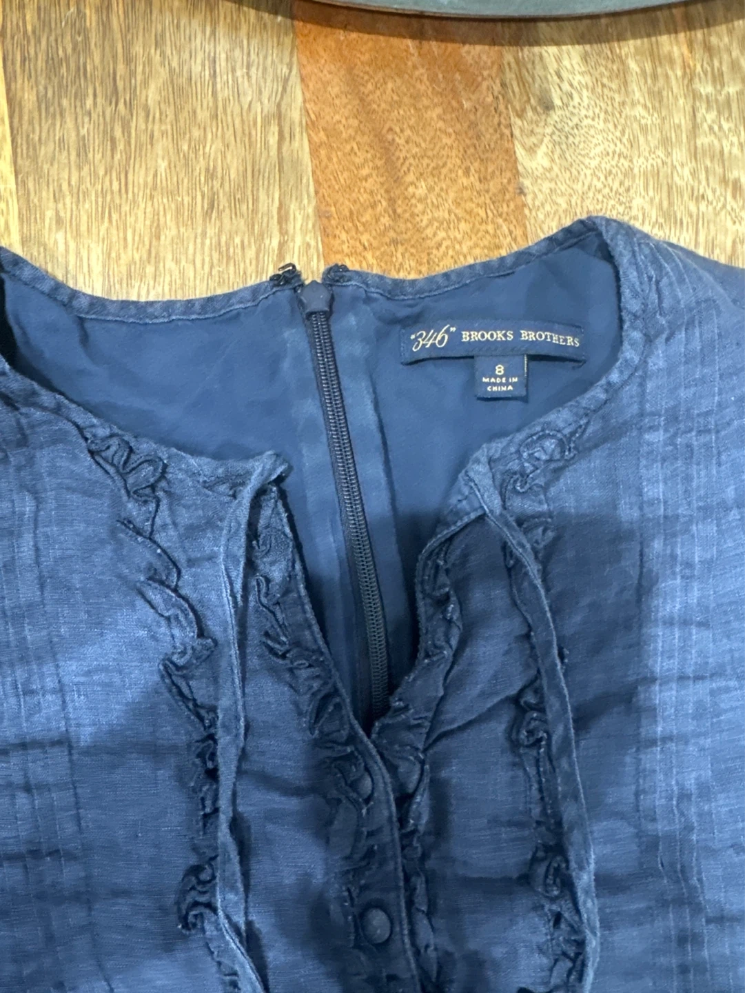 Navy blue linen blend dress from Brooks Brothers. Button front with ruffled detail and tie neck. Size is 8. Made in China.