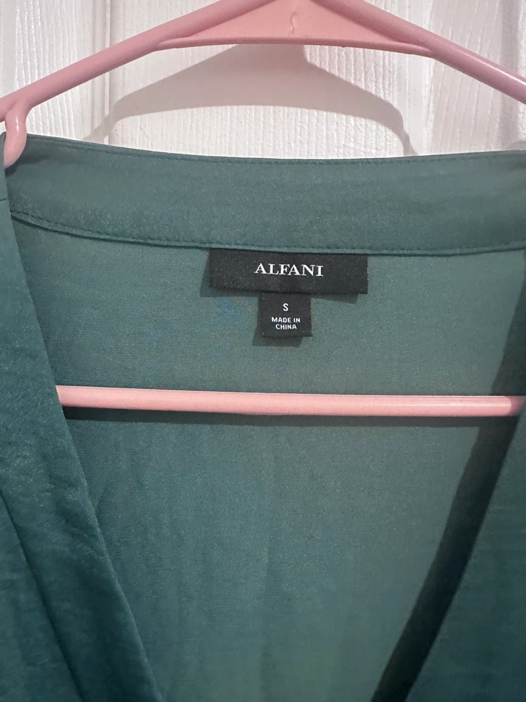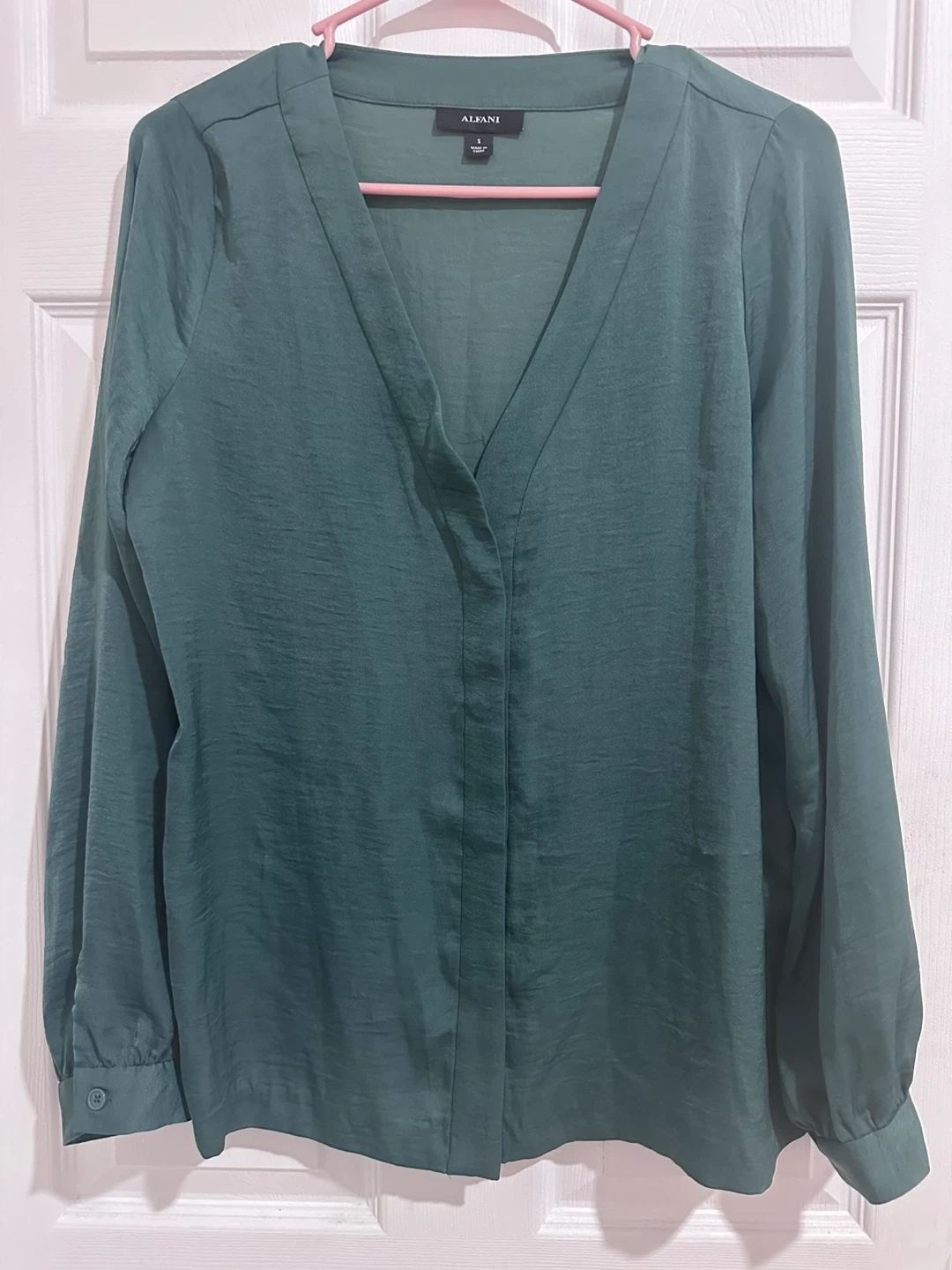 This Alfani V-neck blouse comes in a deep green color. It's a size small with long sleeves. The fabric has a slight sheen.
