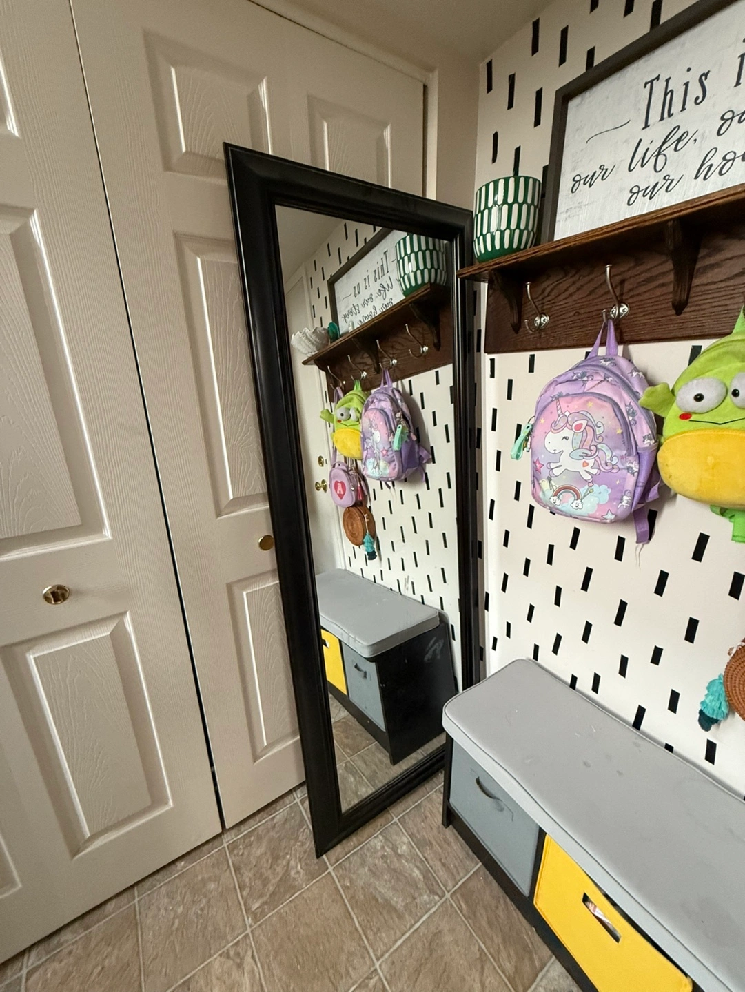 Selling a full length mirror with a black frame. It's in good condition and ready to brighten up any room! Great for checking your outfit or adding depth to a space