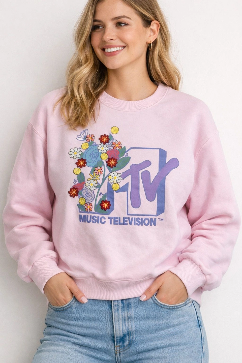 MTV Music Television Pink Embroidered Floral Sweatshirt | Women’