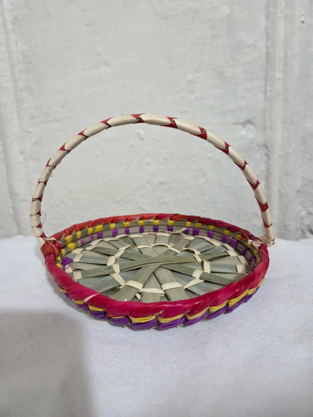 This decorative basket is woven from natural palm leaves. It features colorful accents of red, yellow, and purple along the rim and a red and white braided handle. The woven design is intricate and charming!