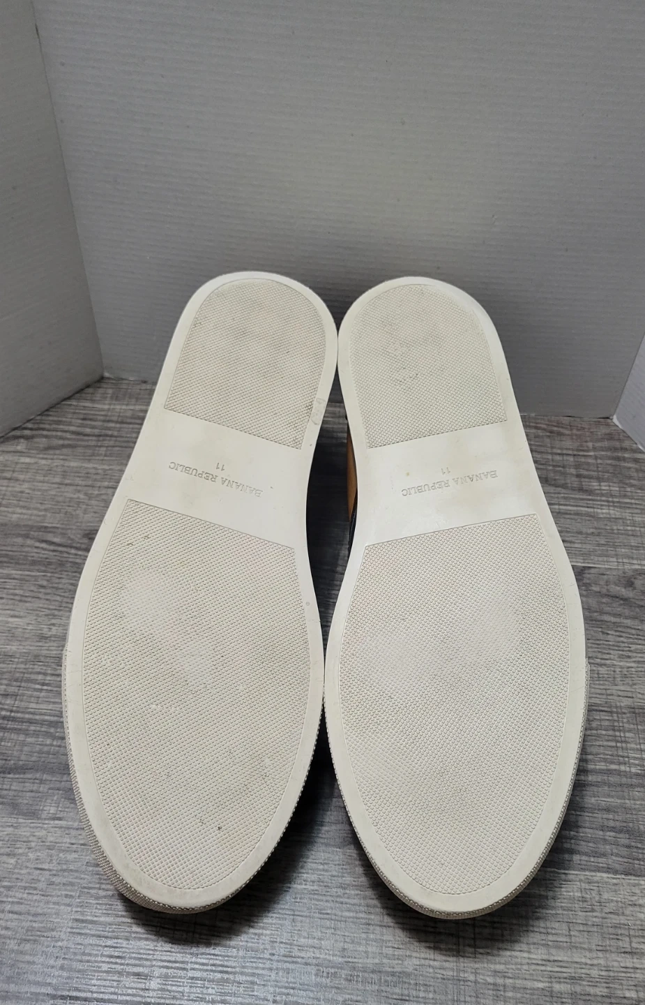 Banana Republic slip-on sneakers in black and tan leather. These shoes feature a comfortable elastic gore for easy wear. Size 11.