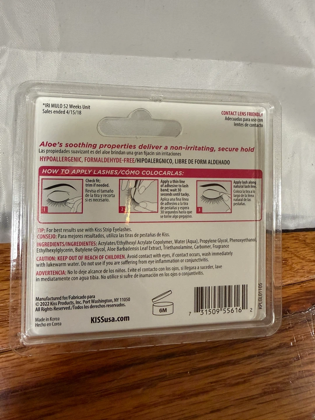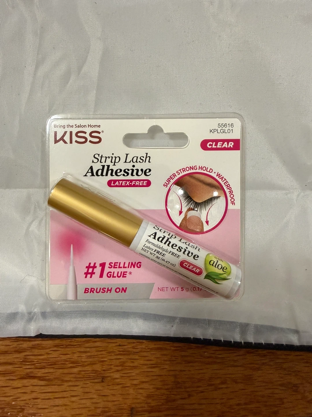 This is KISS Strip Lash Adhesive, a clear, latex-free formula with aloe. It's a brush-on glue for false lashes, offering a super strong hold and waterproof finish. It's hypoallergenic and formaldehyde-free. Net Wt 5 g (0.17 oz).