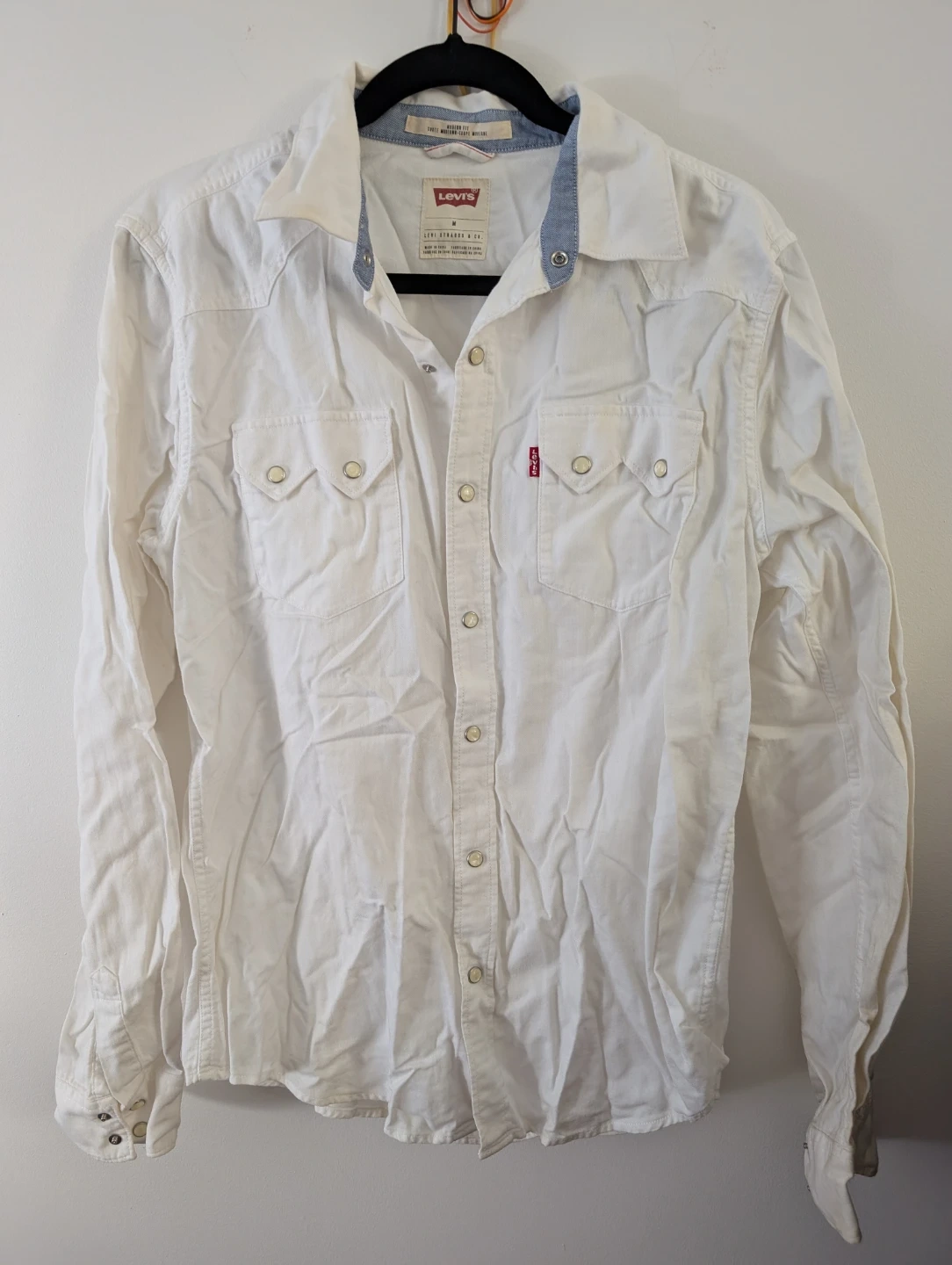 White Levi's shirt in a modern fit. Features dual chest pockets and a classic western snap-button closure. Made from 100% cotton.