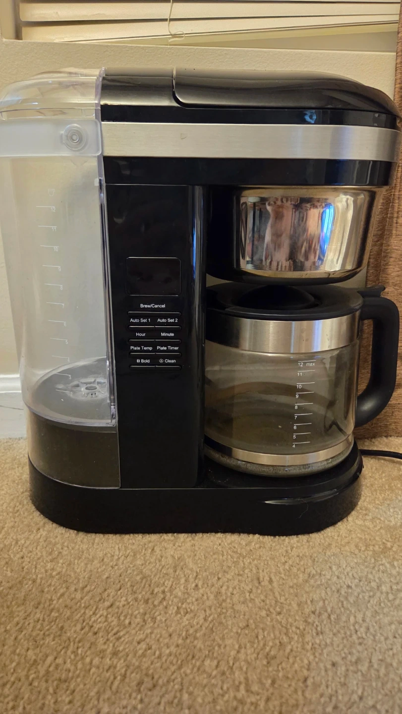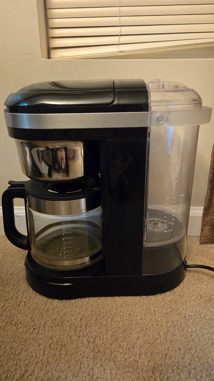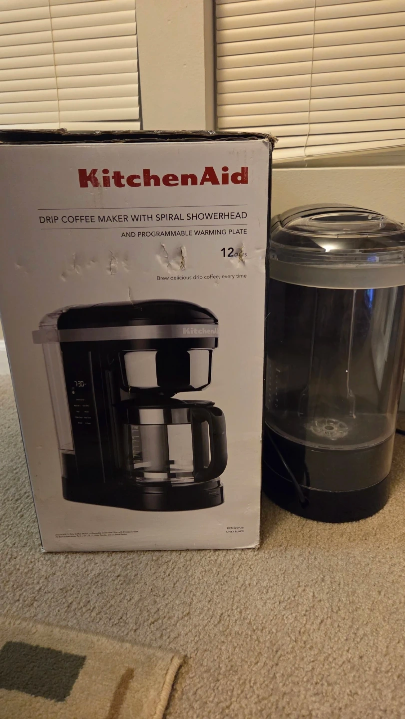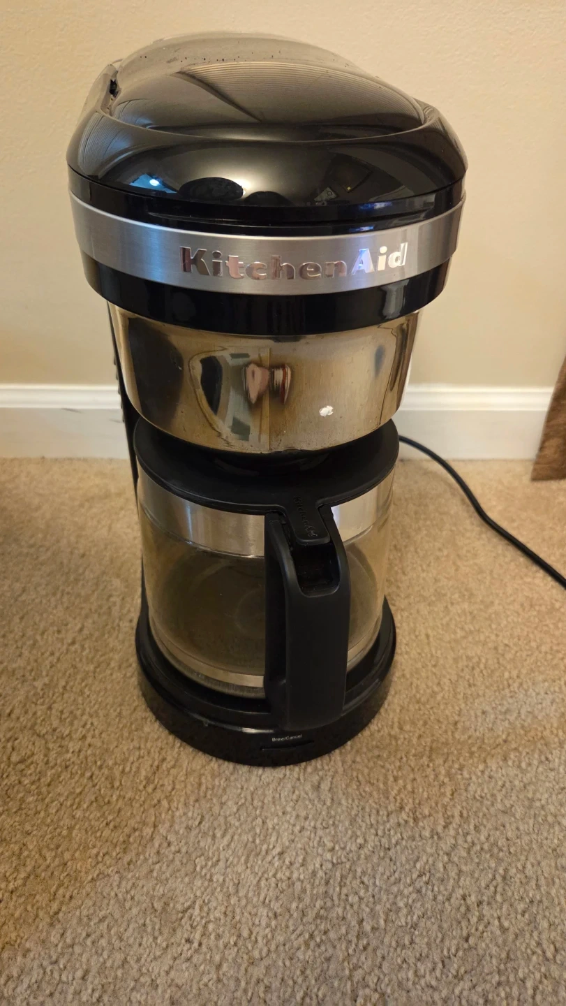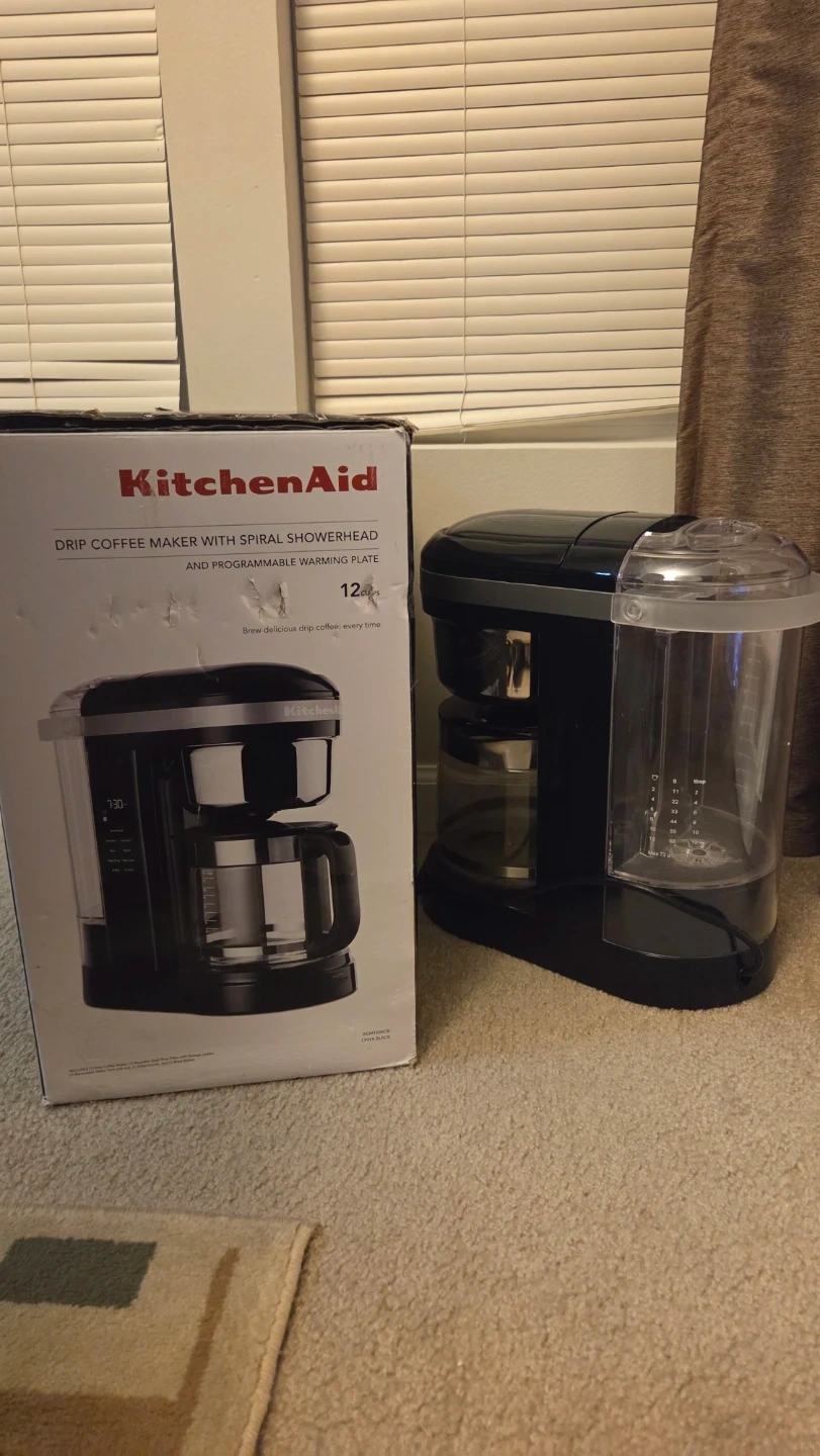 This is a black KitchenAid drip coffee maker with a spiral showerhead. It's programmable and has a warming plate. Brews up to 12 cups. Like new, barely used