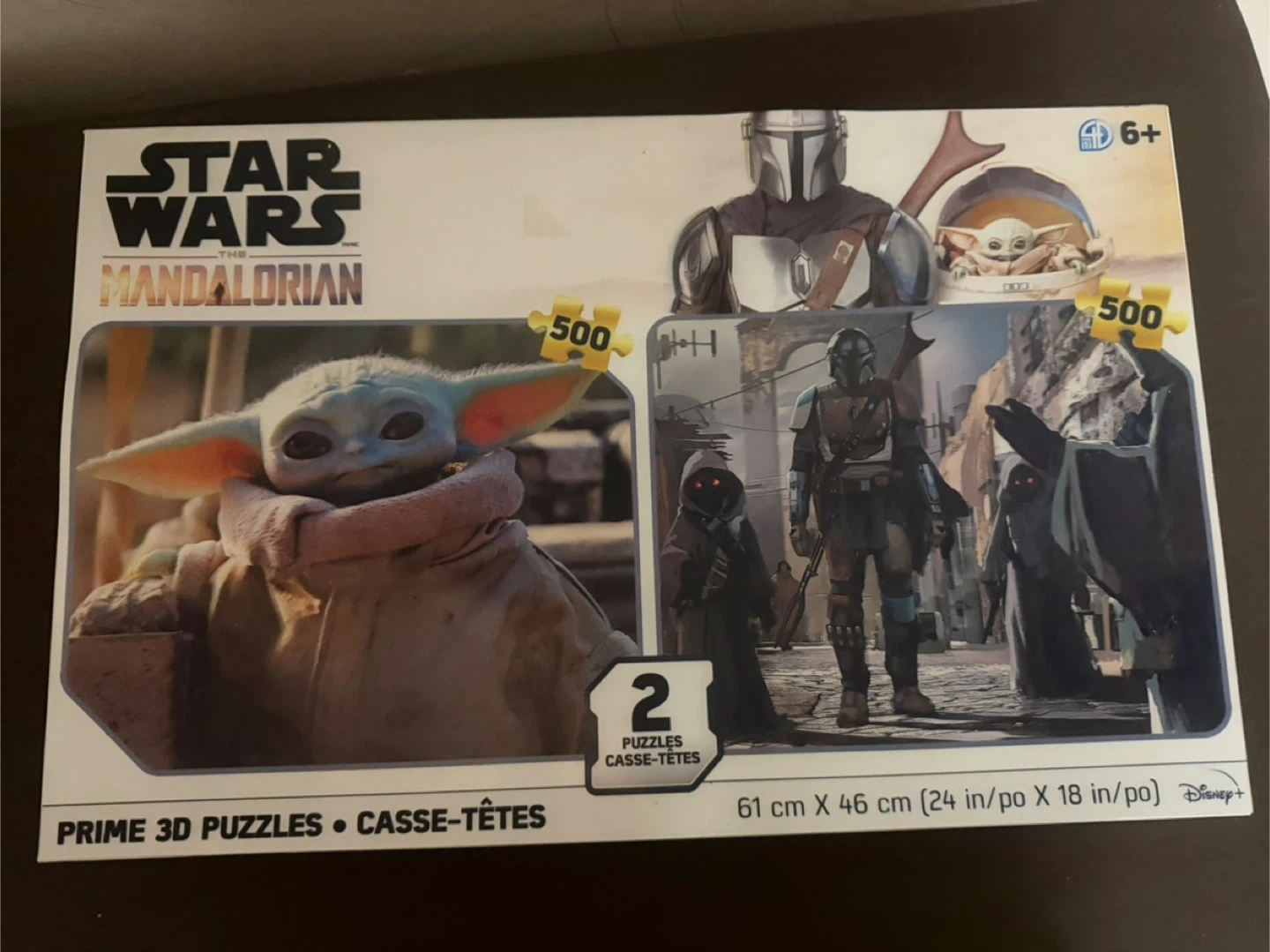 This set includes two 3D puzzles featuring characters from Star Wars: The Mandalorian. Each puzzle has 500 pieces. Completed puzzles measure 61 cm x 46 cm (24 in/po x 18 in/po).