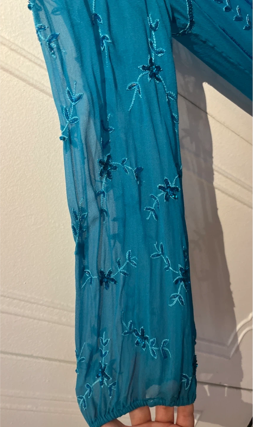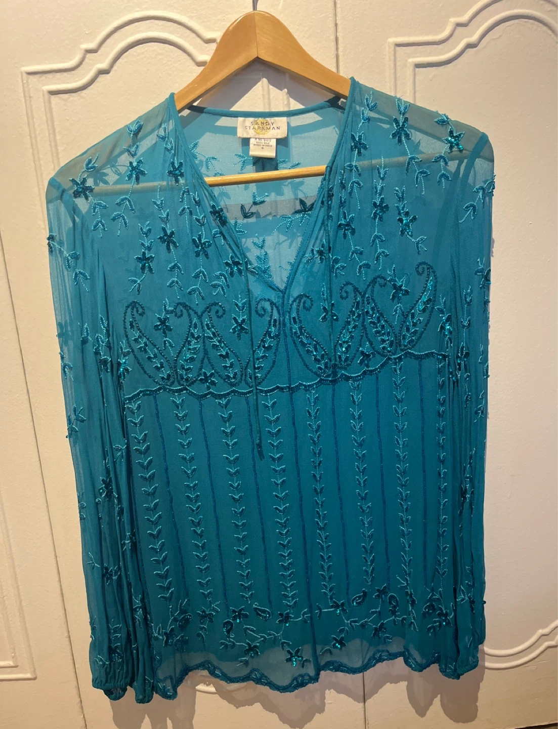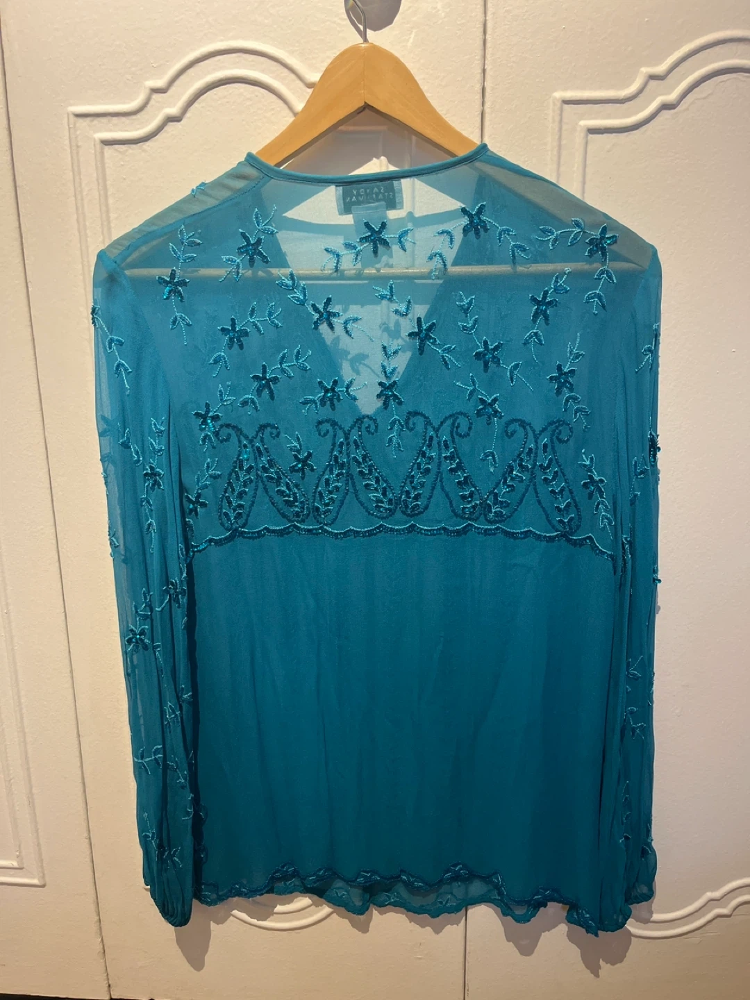 Vintage teal sheer blouse from Sandy Starkman features intricate embroidery and beading throughout. It's made of 100% silk. This top's delicate design makes it a beautiful layering piece.