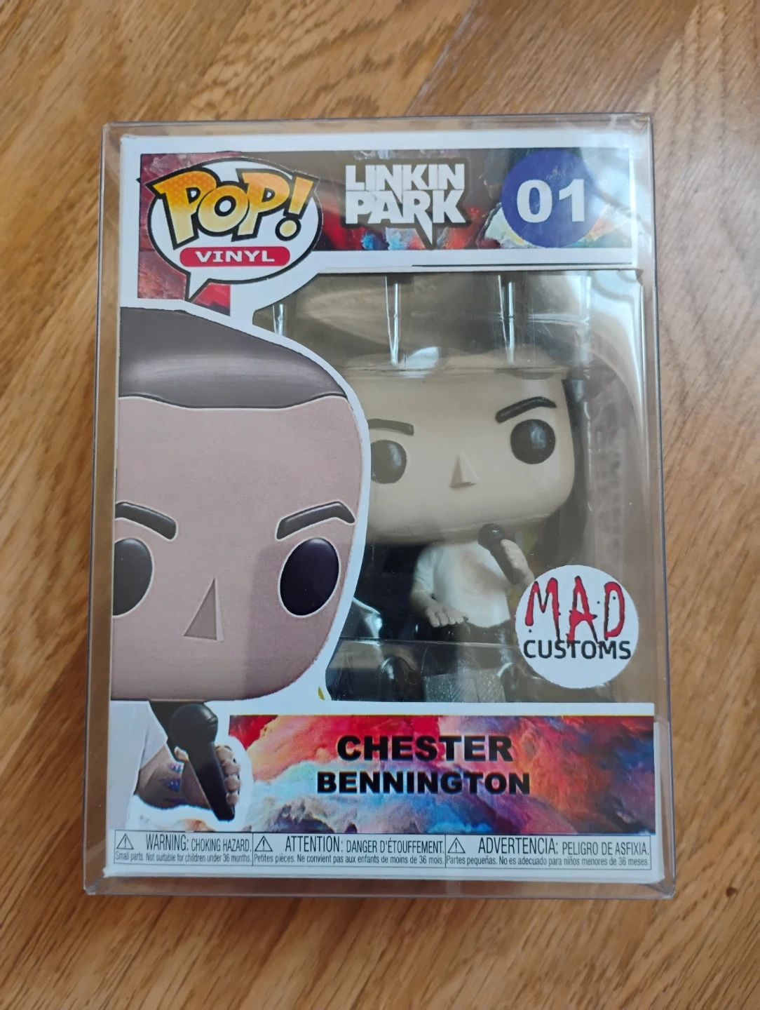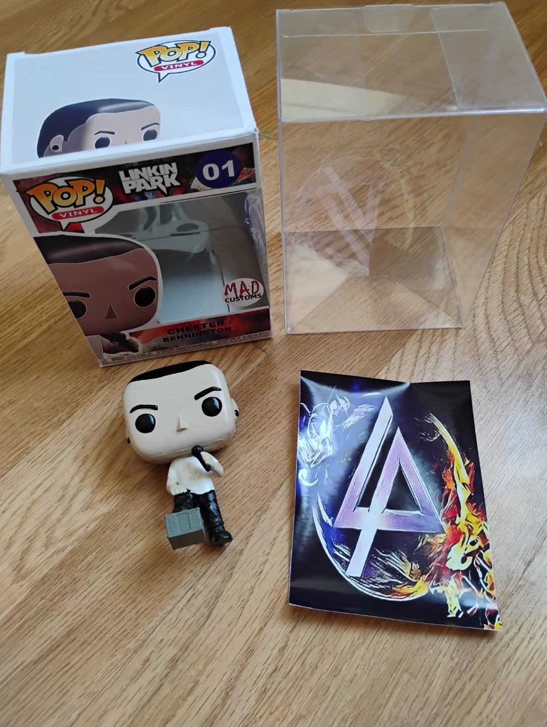 This is a Mad Customs custom 3D pronted vinyl figure of Chester Bennington from Linkin Park. It's number 01 in the collection. Includes the original box and protective case. Also comes with a Linkin Park sticker. Please note this is a custom figure and not produced by Funko Pop.