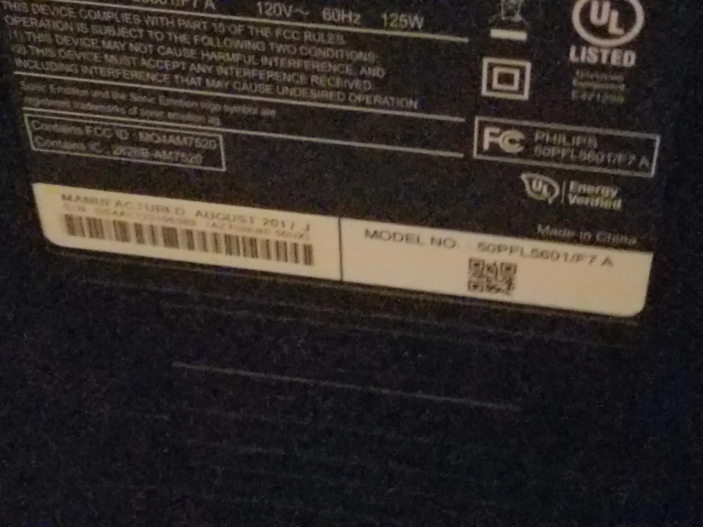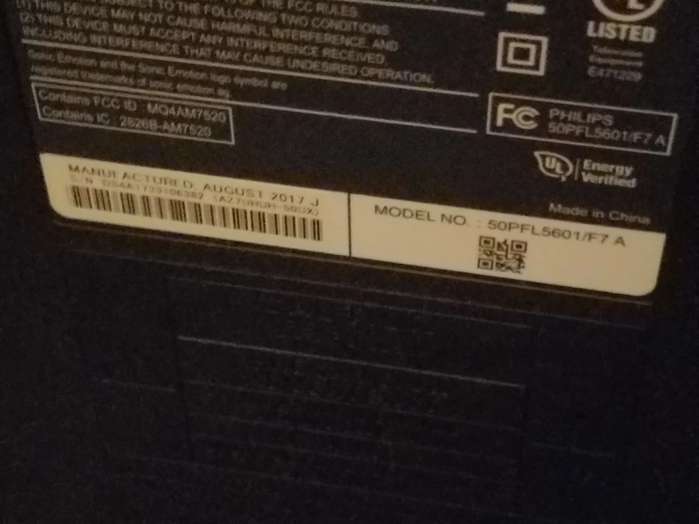 Selling a Philips 50-inch TV, model number 50PFL5601/F7 A. It was manufactured in August 2017. The estimated yearly energy cost is $20.