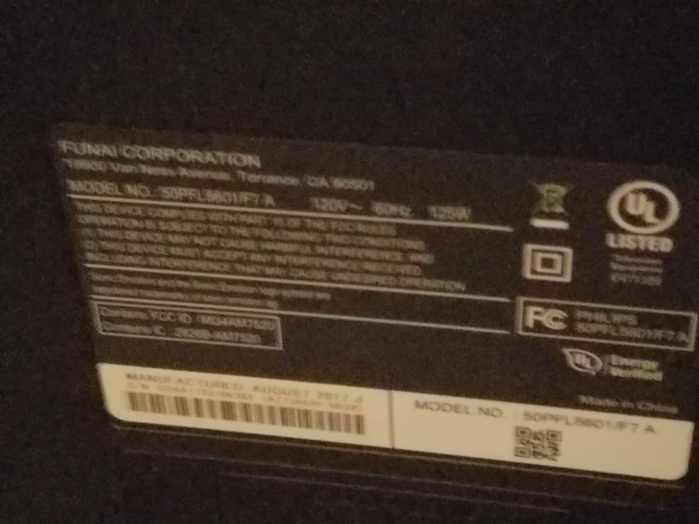 Selling a Philips 50-inch TV, model number 50PFL5601/F7 A. It was manufactured in August 2017. The estimated yearly energy cost is $20.