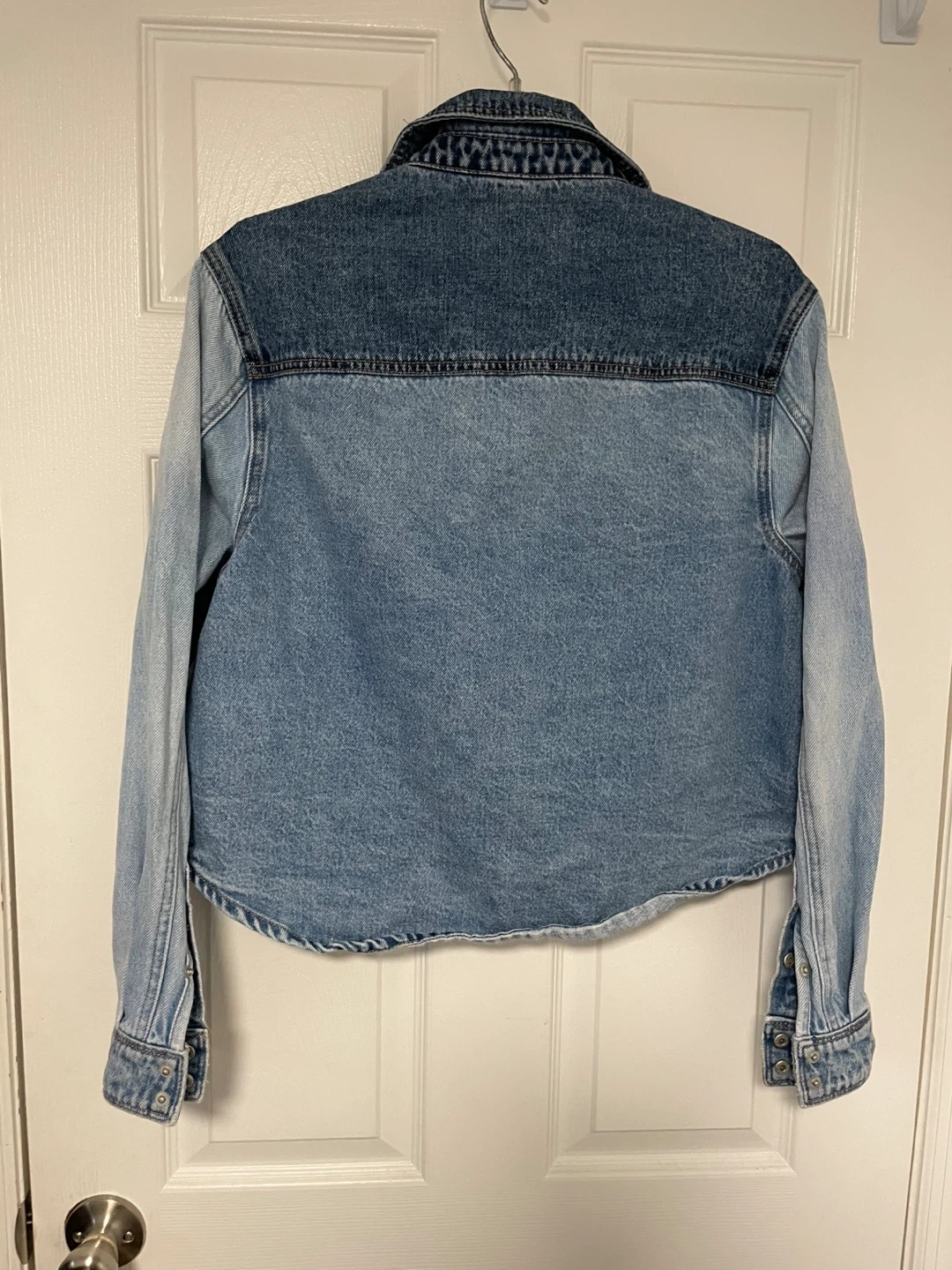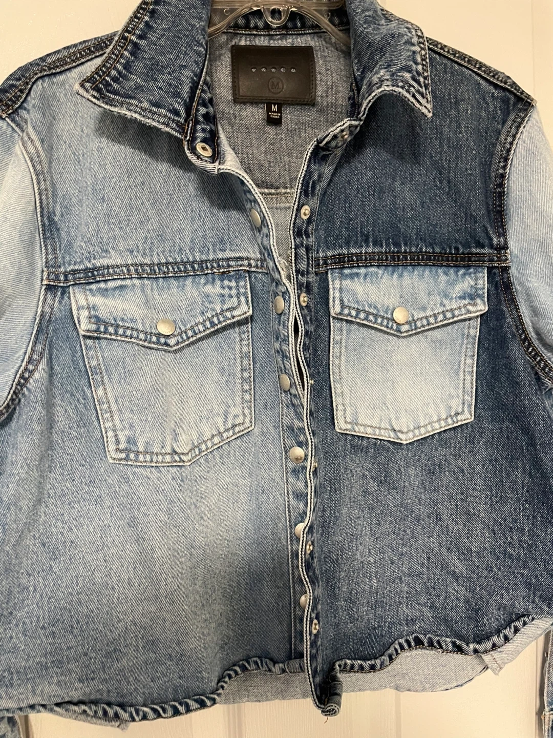 Selling a Blank NYC denim jacket in size medium. It features a unique two-tone denim design. Great for layering or wearing on its own!