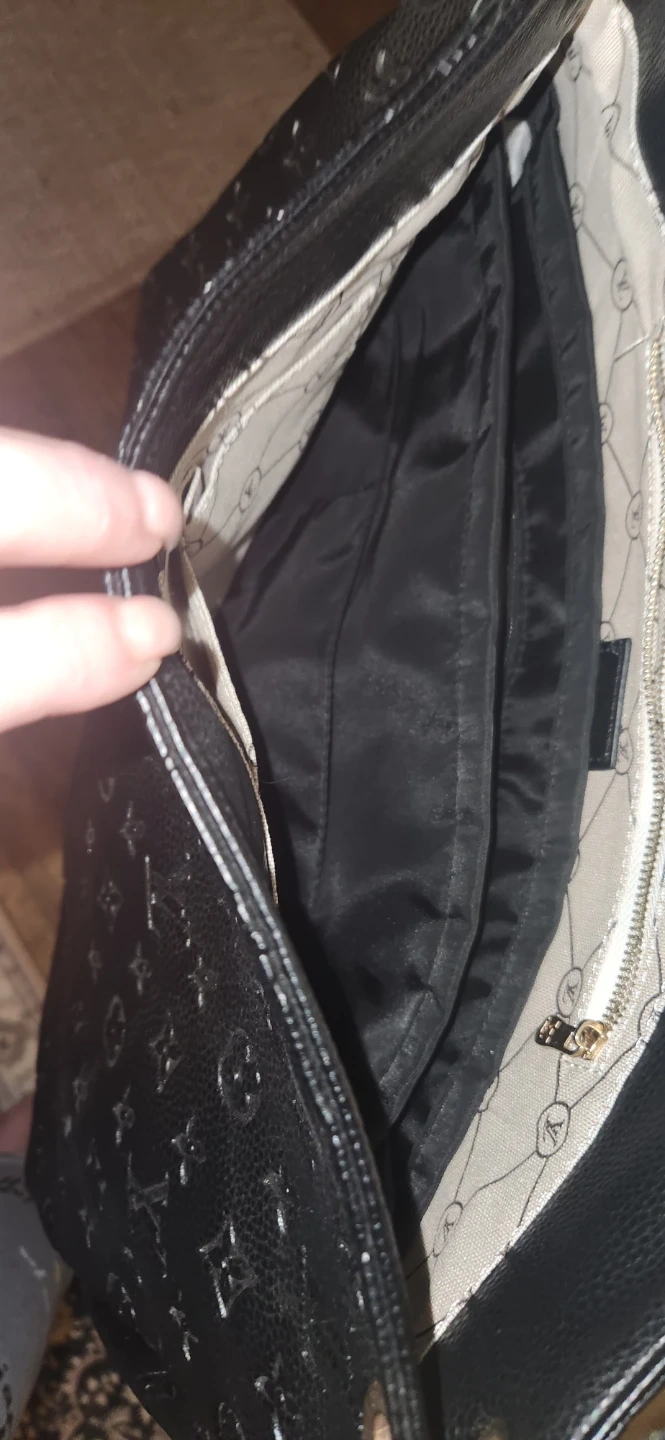 Stylish black shoulder bag with embossed Louis Vuitton Paris pattern. Features a braided handle and a spacious interior with multiple compartments. Made from durable material. Good for lap top , over night Bag