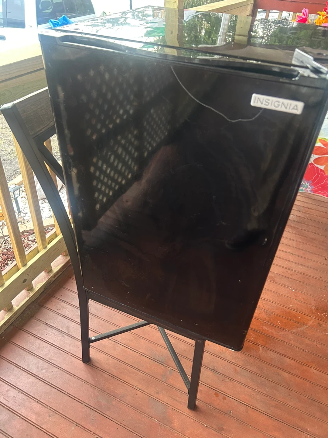 This is a black Insignia compact refrigerator. It's a free-standing unit with a reversible door. Interior features include adjustable shelves and door storage.