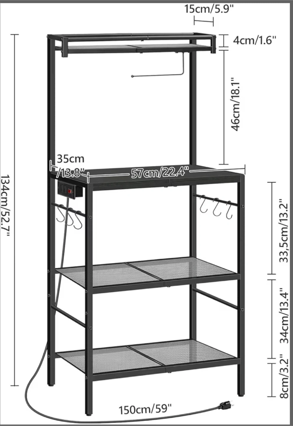 This is a black metal baker's rack with three shelves and hanging hooks. The overall dimensions are 150cm (59") tall and 150cm (59") wide. It includes a top shelf measuring 46cm (18.1") high and a width of 57cm (22.4"). The rack has a mesh design for the shelves. It's useful for organizing kitchen items and can hold appliances.