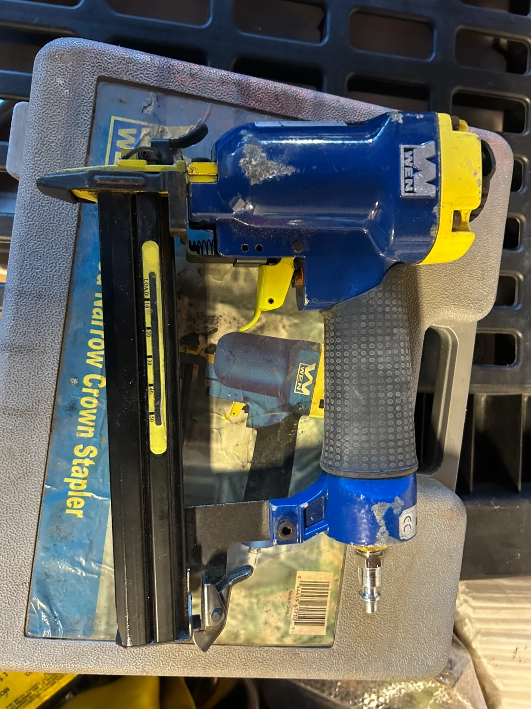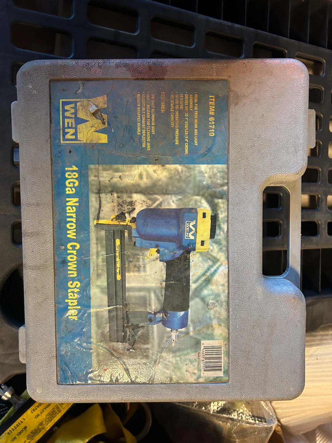 Selling a WEN 18Ga Narrow Crown Stapler, model 61710. It's designed for thin work and light assembly. Features a quick release aluminum body for easy jam clearing, a magazine capacity of 100, and stable capacity. Comes with the original case