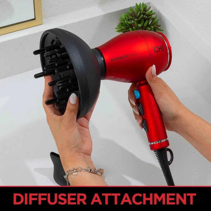The CHI 1875 Series Advanced Ionic Compact Hair Dryer features a built-in ion generator that emits negative ions to reduce frizz and increase shine. It also decreases drying time. CHI Ceramic Technology locks in moisture and maintains body. Ion Generator reduces frizz and minimizes fly-aways. Adjustable 3 Heat / 2 Speed Settings. Cold Shot Button locks in curls, waves and styles. Lightweight and Powerful DC motor. Super Compact, space saver design. Removable filter prevents lint buildup and extends motor life. 6.5ft. cord for convenience. Air Nozzle Concentrator and Diffuser included.