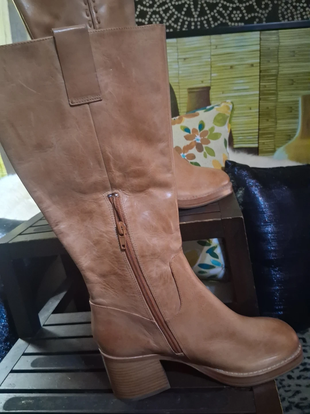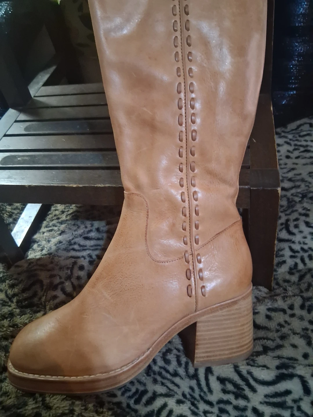 Chocolat Blu knee-high boots in a tan leather. Features decorative stitching detail up the shaft and a stacked heel. Vero Cuoio sole. Size 7.