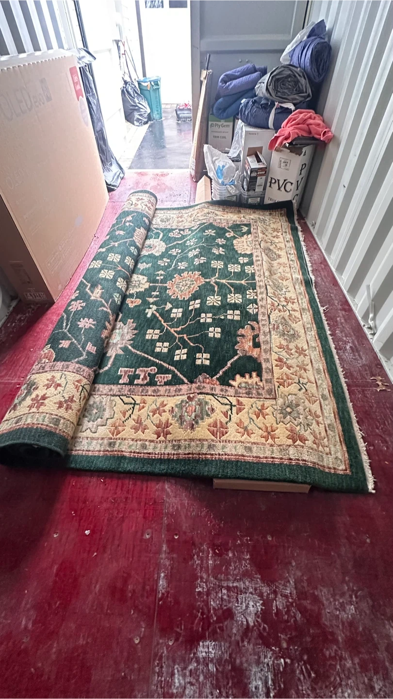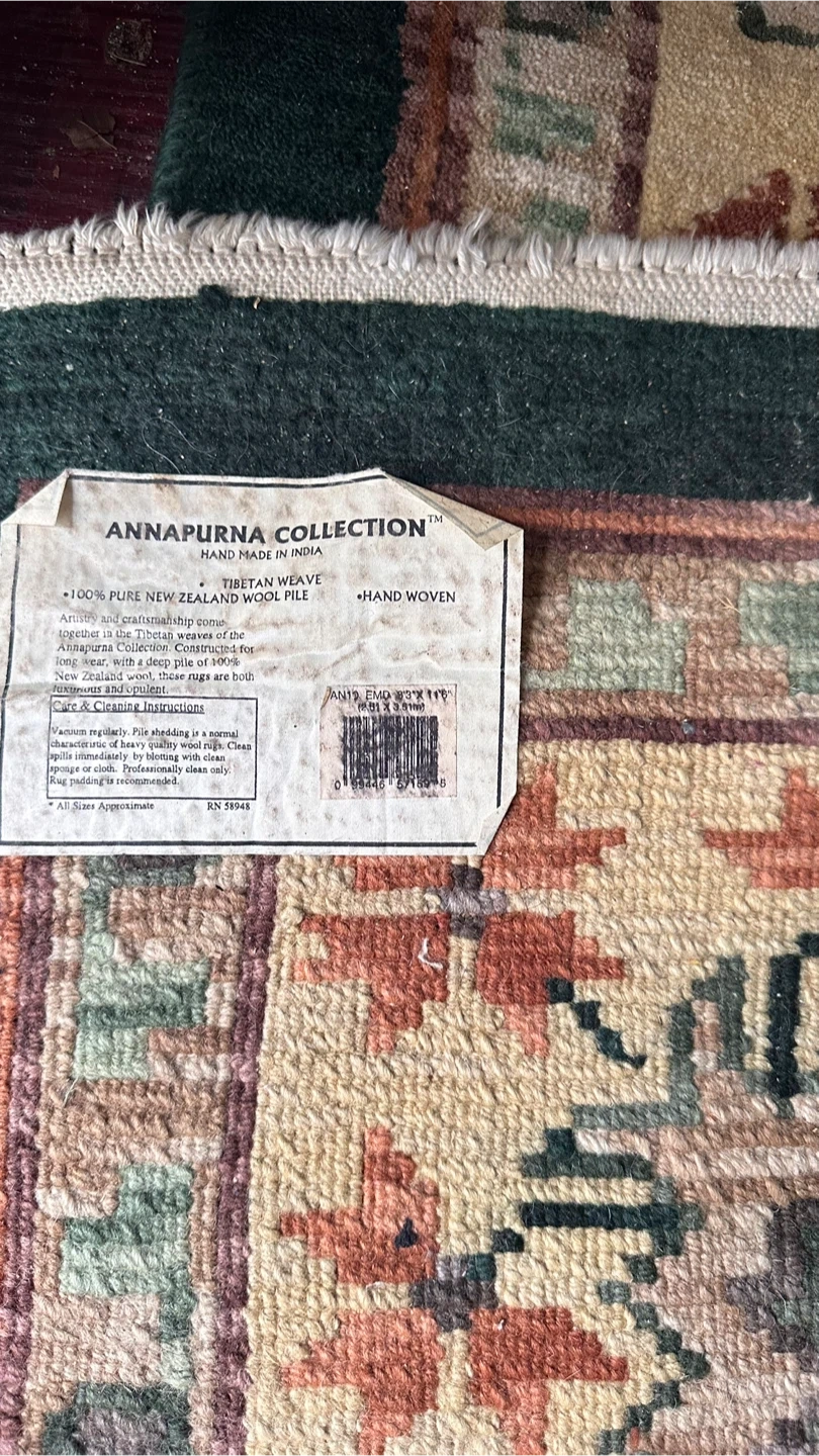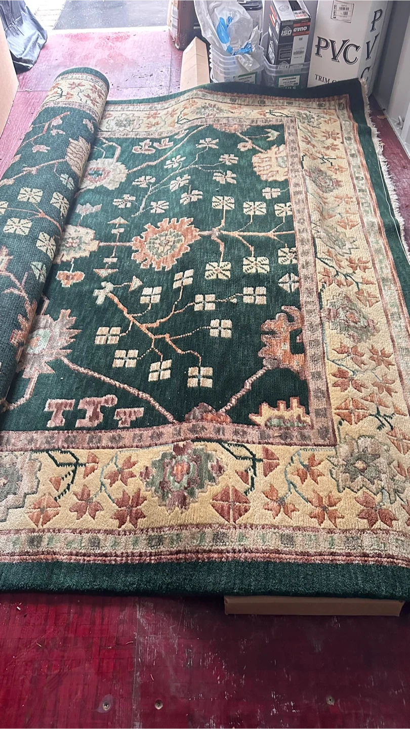 A beautiful hand-woven area rug in a deep green color. Features a floral and botanical pattern with a contrasting border. Measures 9.50x13.50