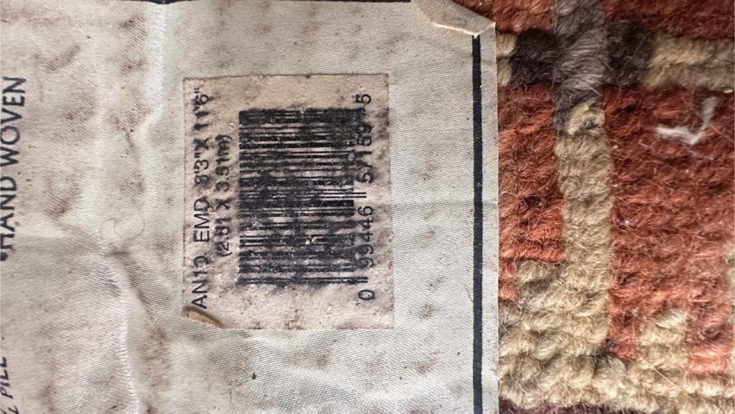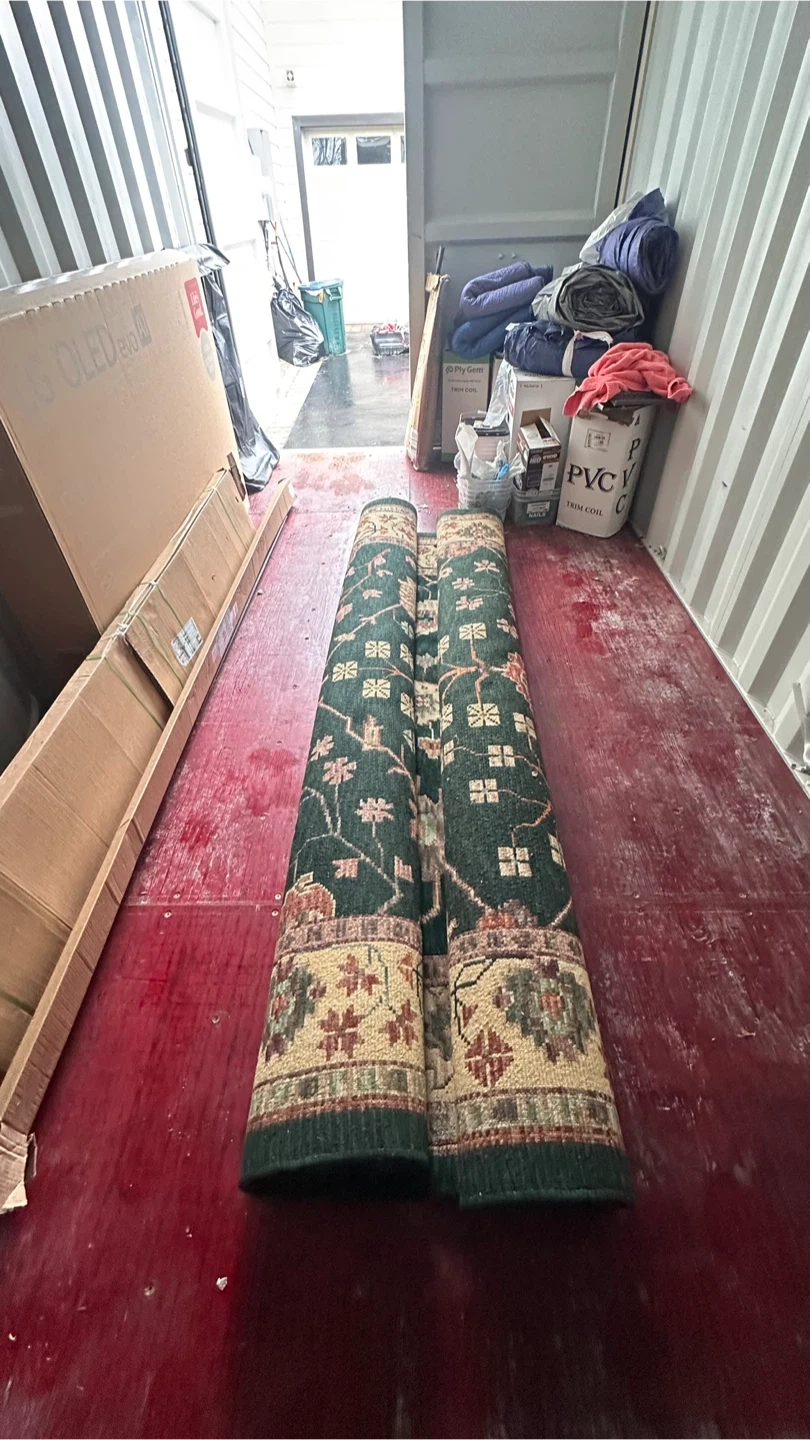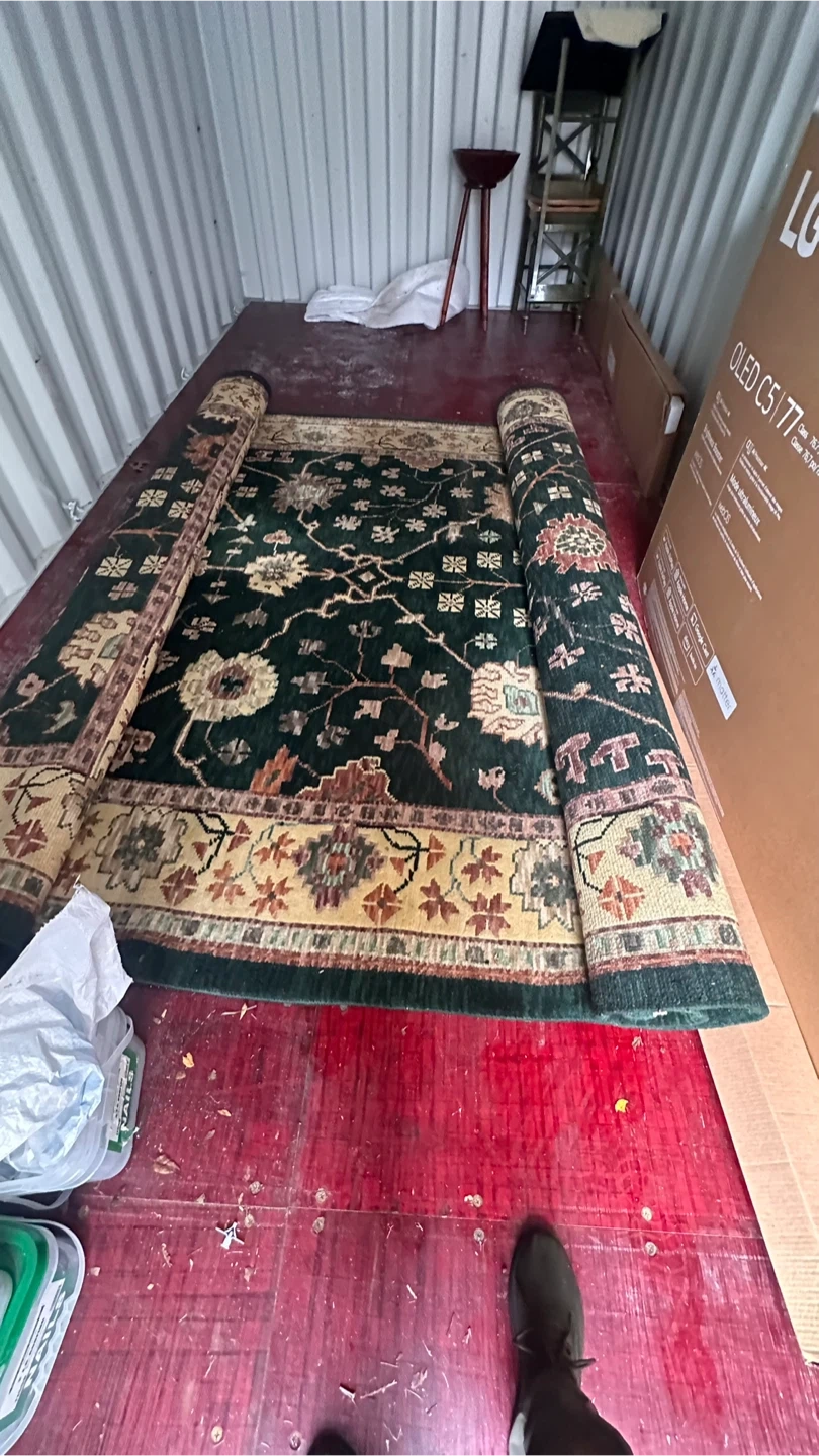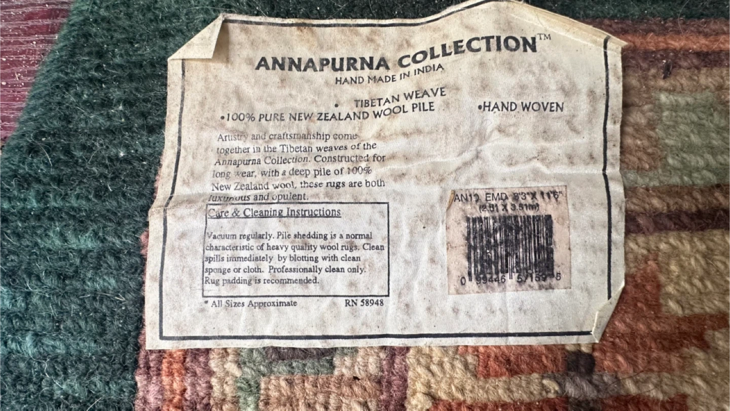 A beautiful hand-woven area rug in a deep green color. Features a floral and botanical pattern with a contrasting border. Measures 9.50x13.50