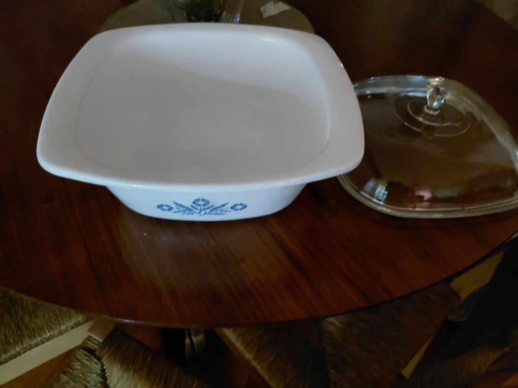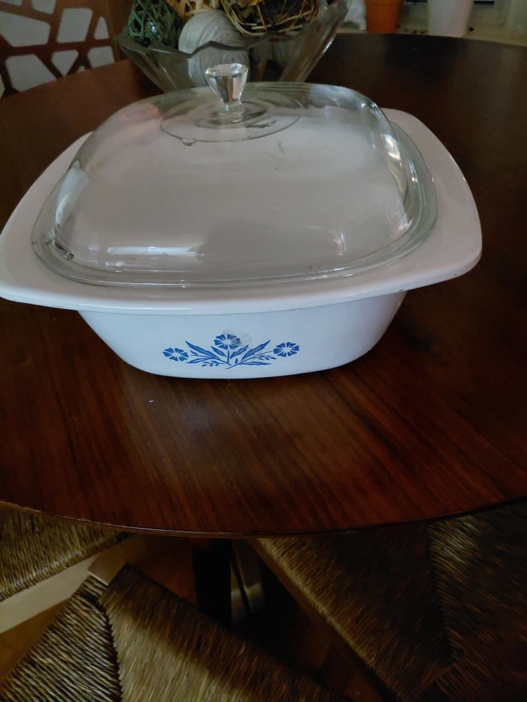 Selling a vintage Corning Ware casserole dish with a lid. It's in good condition and features a beautiful blue floral design. Perfect for baking and serving your favorite dishes!