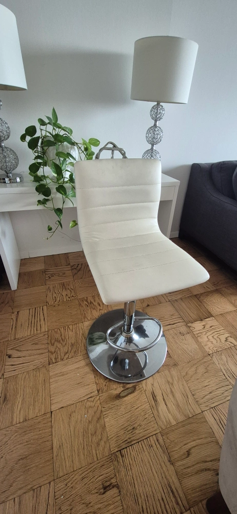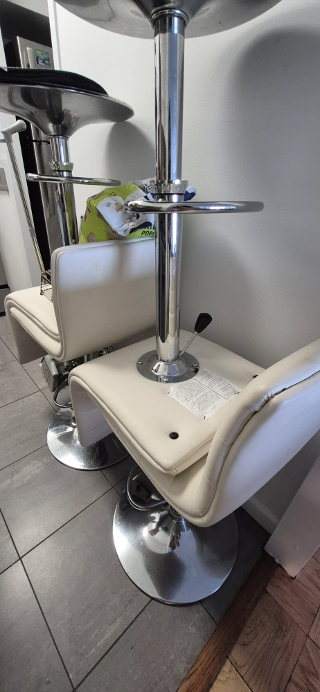 Selling a set of adjustable height swivel bar stools for I moved and they no longer fit in the apartment. The seats are an ivory color with a chrome base. They're in good condition and would look great in any kitchen or bar area!