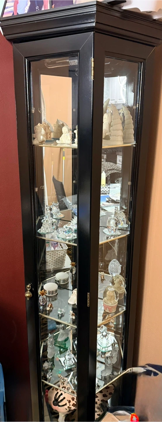 This is a black corner curio cabinet with glass doors and shelves. It's perfect for displaying collectibles or decorative items. The cabinet features mirrored backing and interior lighting.