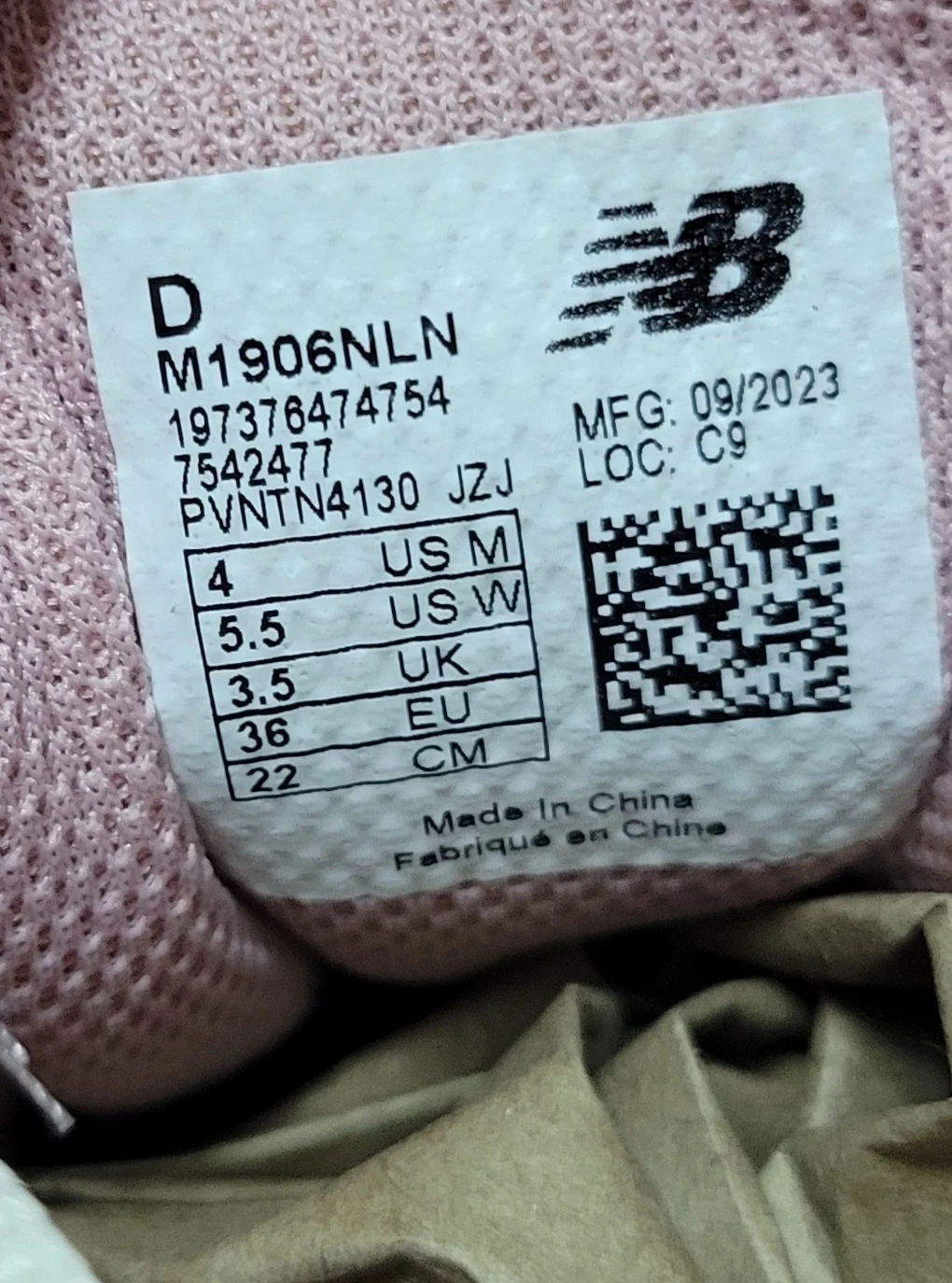 New Balance 1906NLN running shoes in a soft pink color. This is a women's size US W 5.5 (US M 4 / UK 3.5 / EU 36 / CM 22). Manufactured in September 2023. They feature a synthetic and mesh upper.