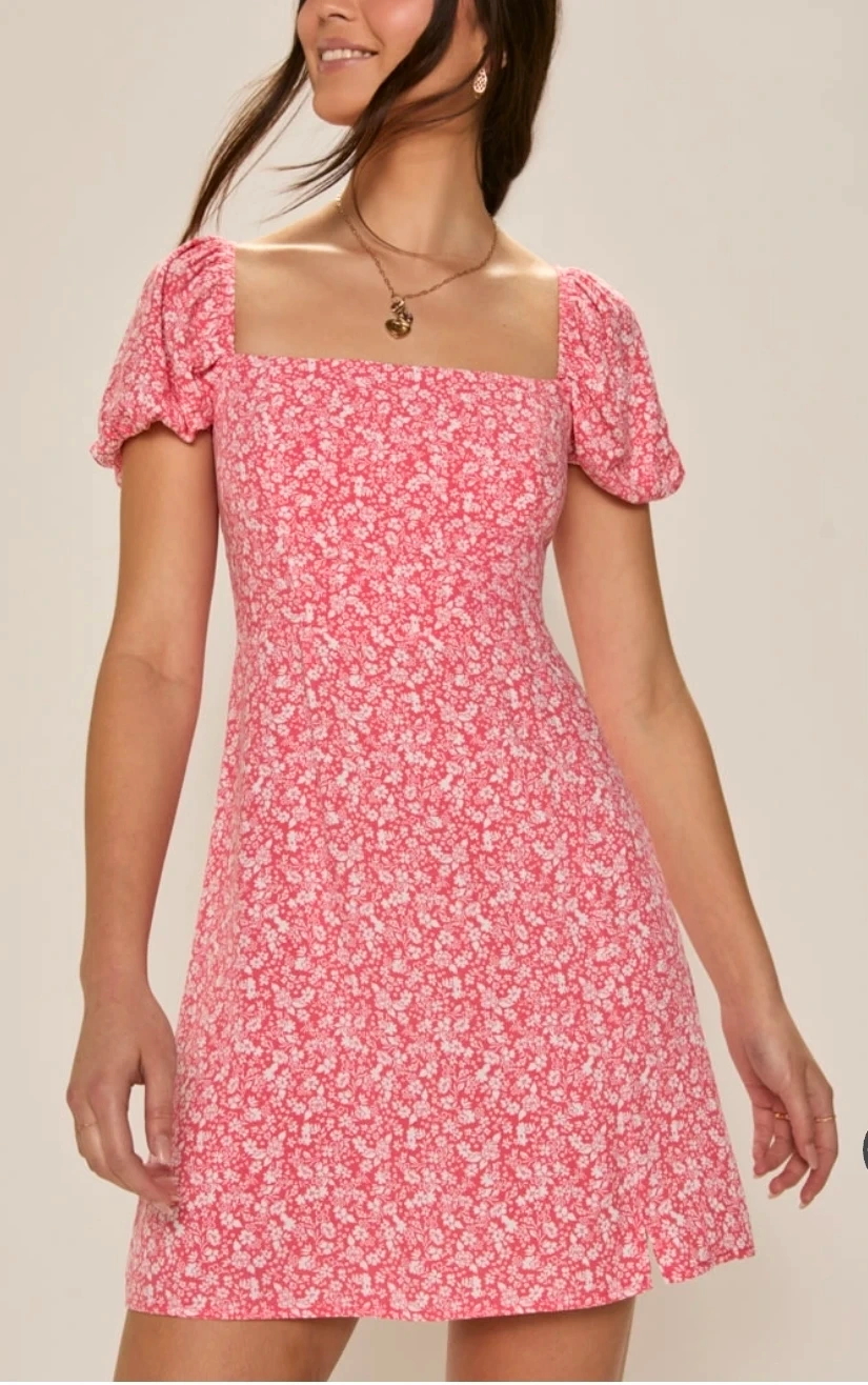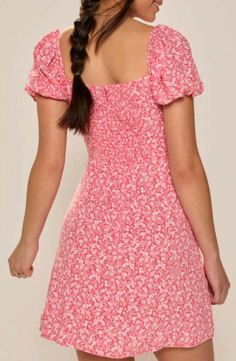 This cute mini dress features a pink floral print and puff sleeves. It has a flattering square neckline and smocked back. Perfect for a summer day out!
