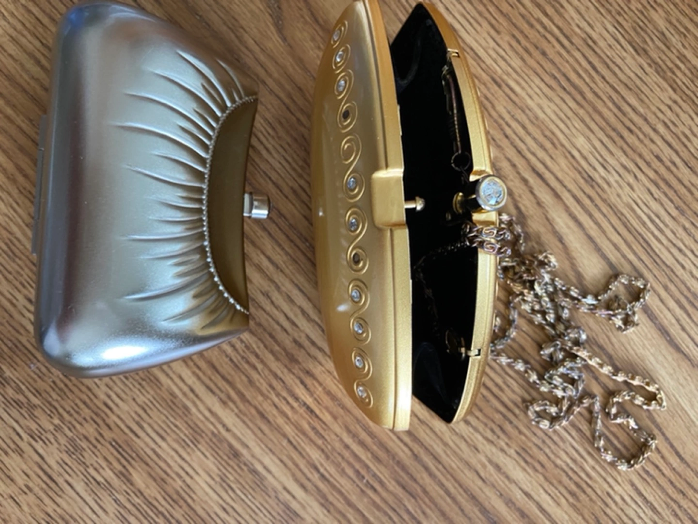 Gold purse comes with a chain for more convenience.