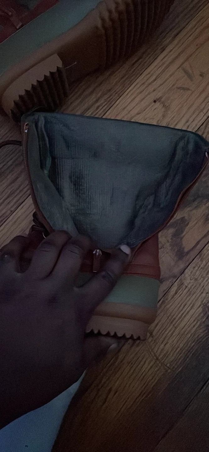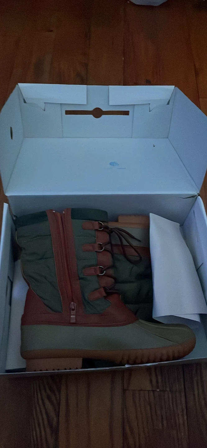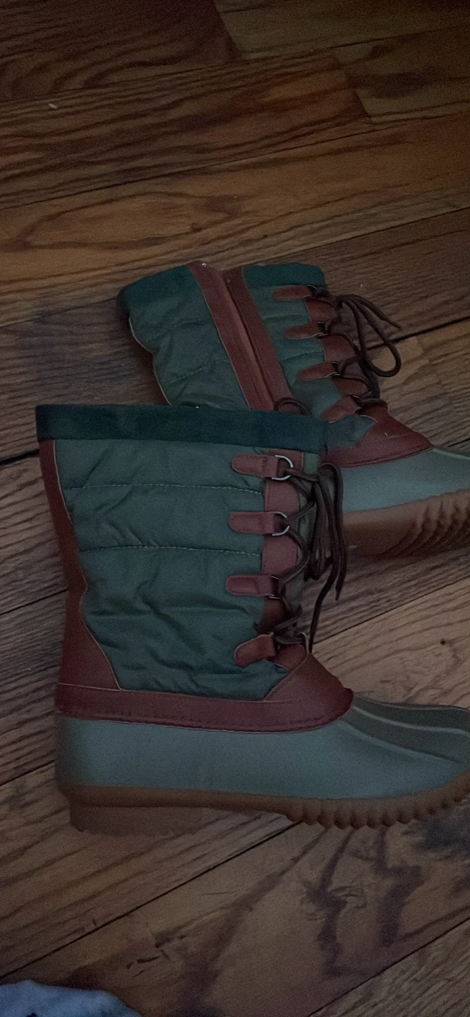Selling a pair of duck boots by Calvin Klein in a green and brown color scheme! They come with a lace-up closure and a zipper on the side. The boots are in used condition and come with the original box.