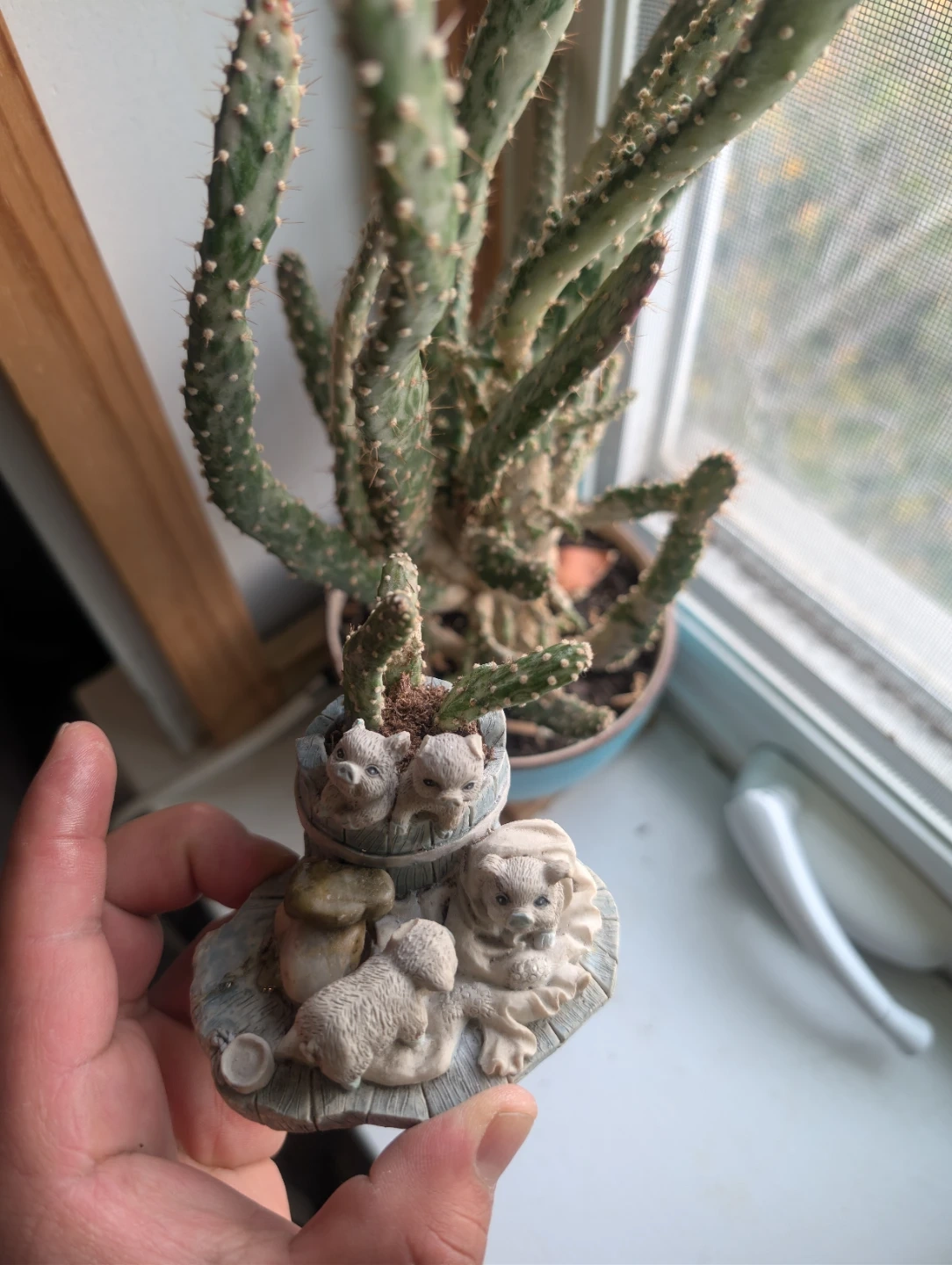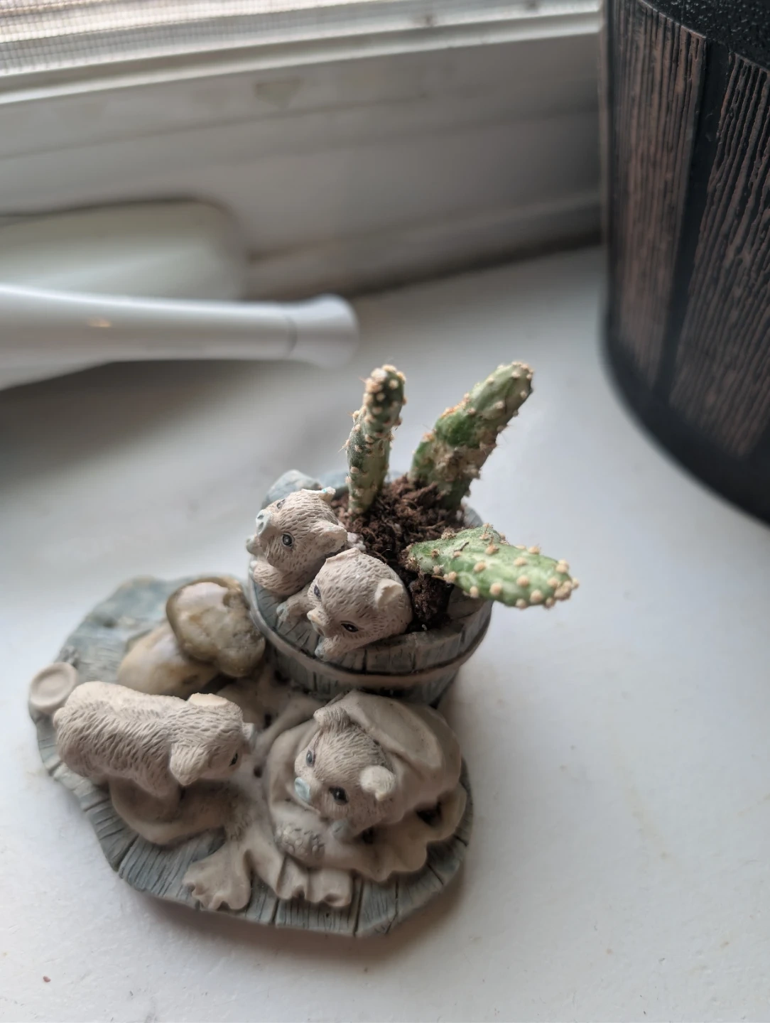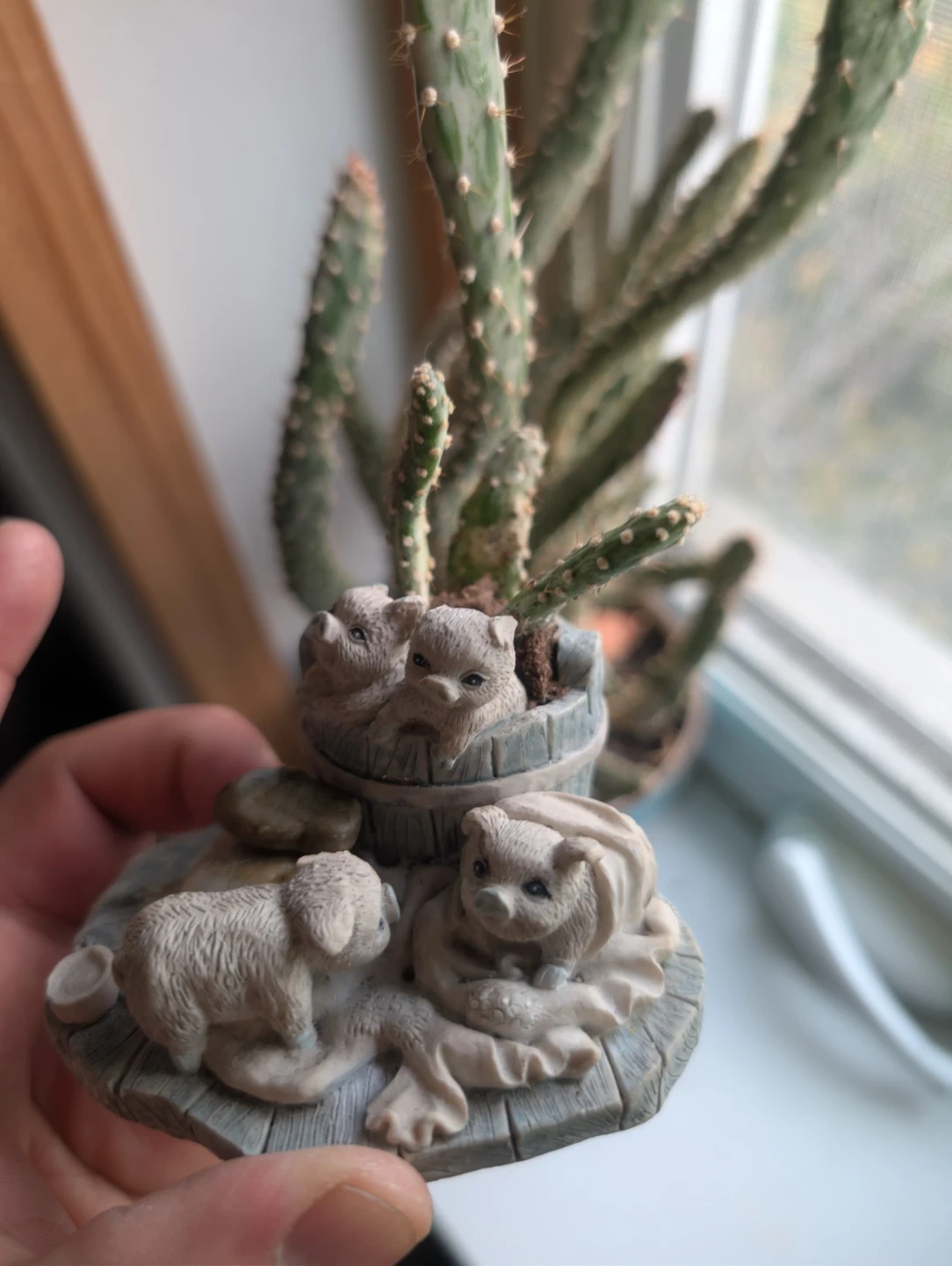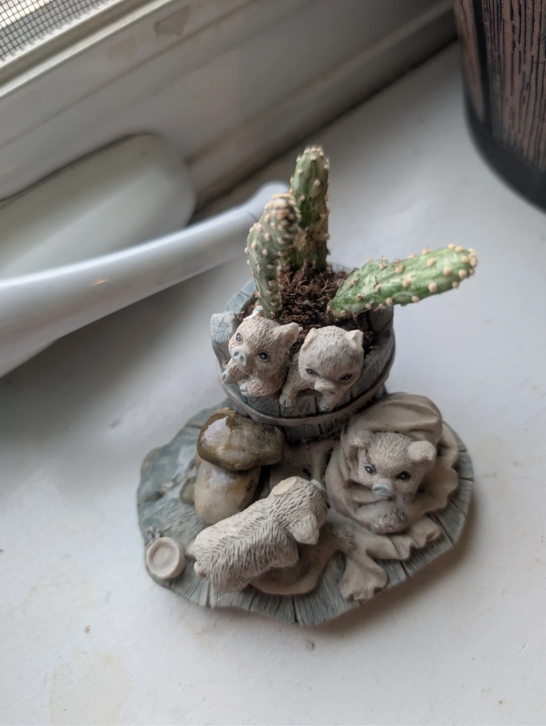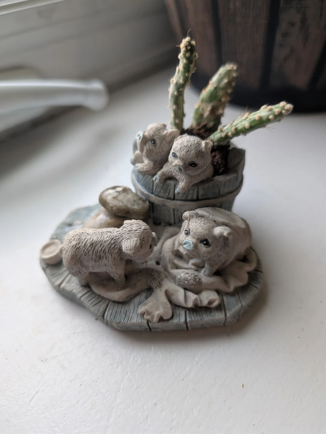 This adorable vintage Enesco Growing Friends figurine features cute animal figures and a small cactus. It's a charming piece that would add a touch of whimsy to any space! It has been gently used and is in good condition.