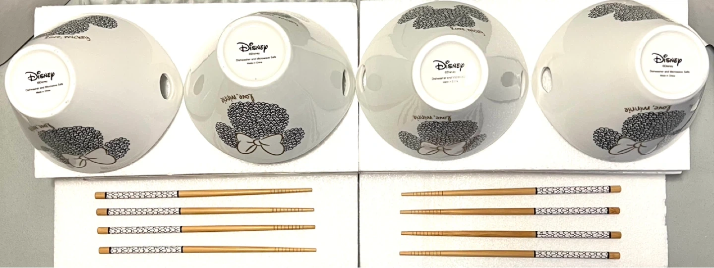 Set of 4 **Disney Mickey & Minnie bowls with matching chopsticks.