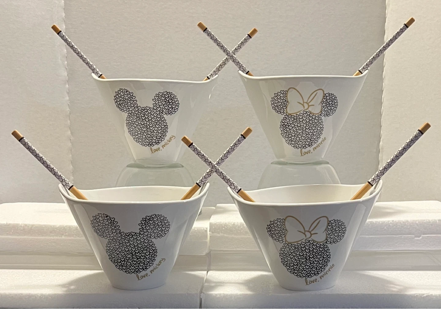Each bowl features Mickey on one side and Minnie on the other, with “love, mickey” and “love, minnie” details—super cute and unique design.