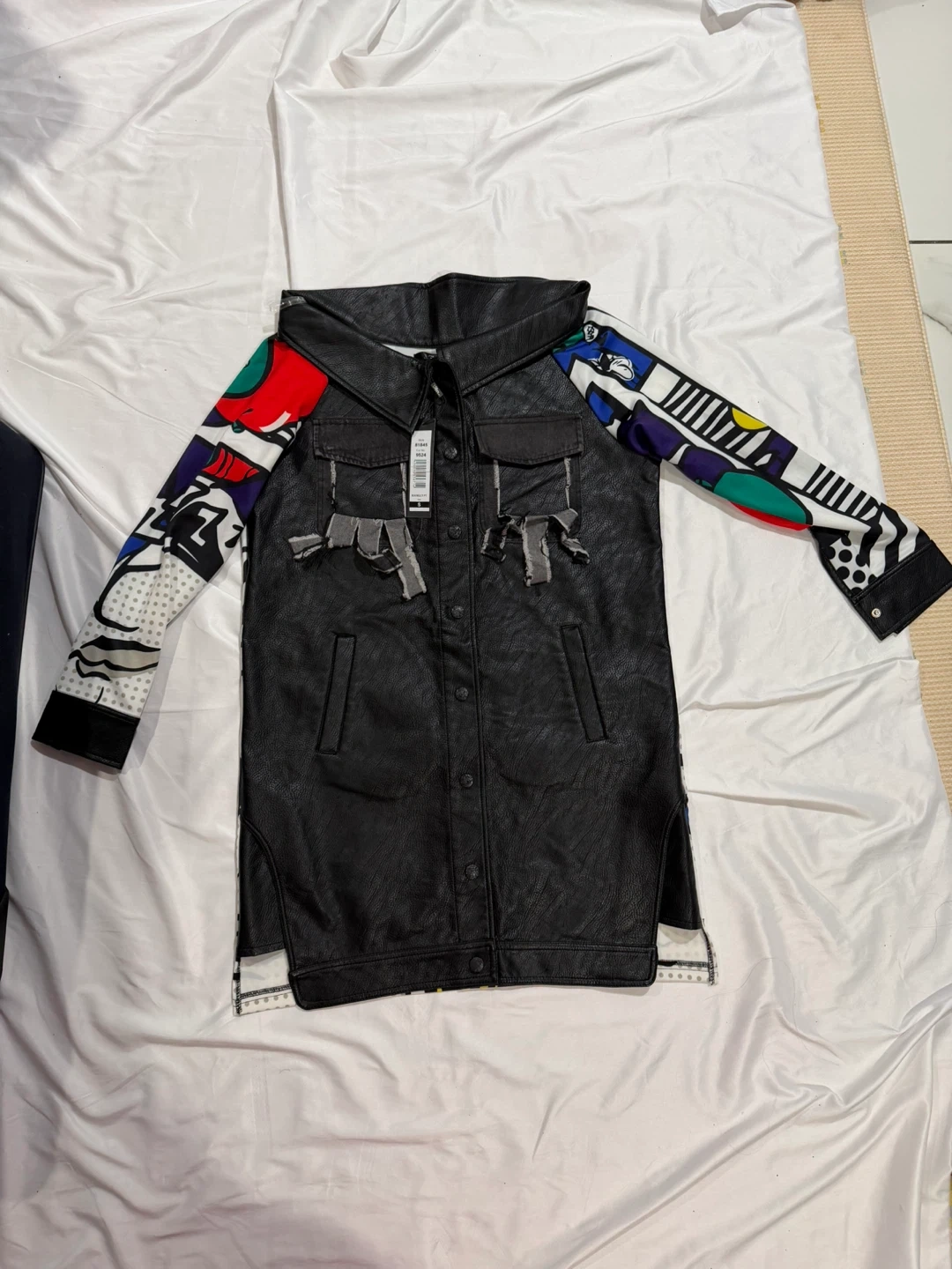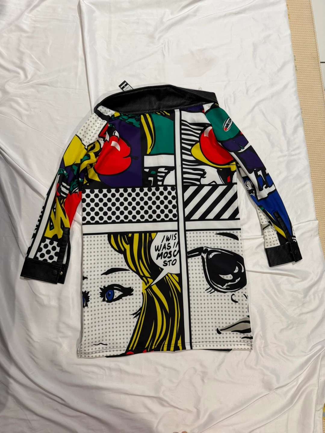 This black dress features a vibrant comic book print on the sleeves and upper body. It has a collared neckline and button-up front. The sleeves are long and designed to resemble panels from a comic strip.