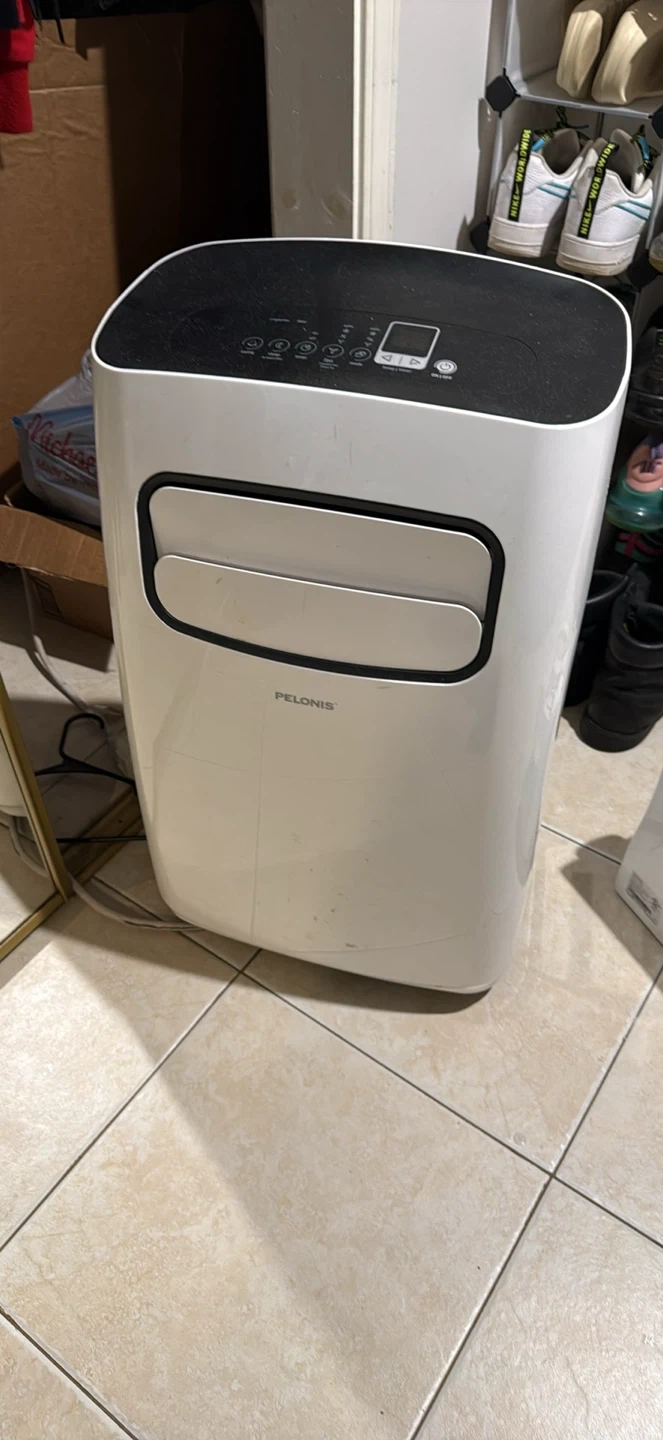 White Pelonis portable air conditioner. It's a great way to cool down a room! It's white with a black top and control panel. Great deal for the winter because prices are sky high in the summer