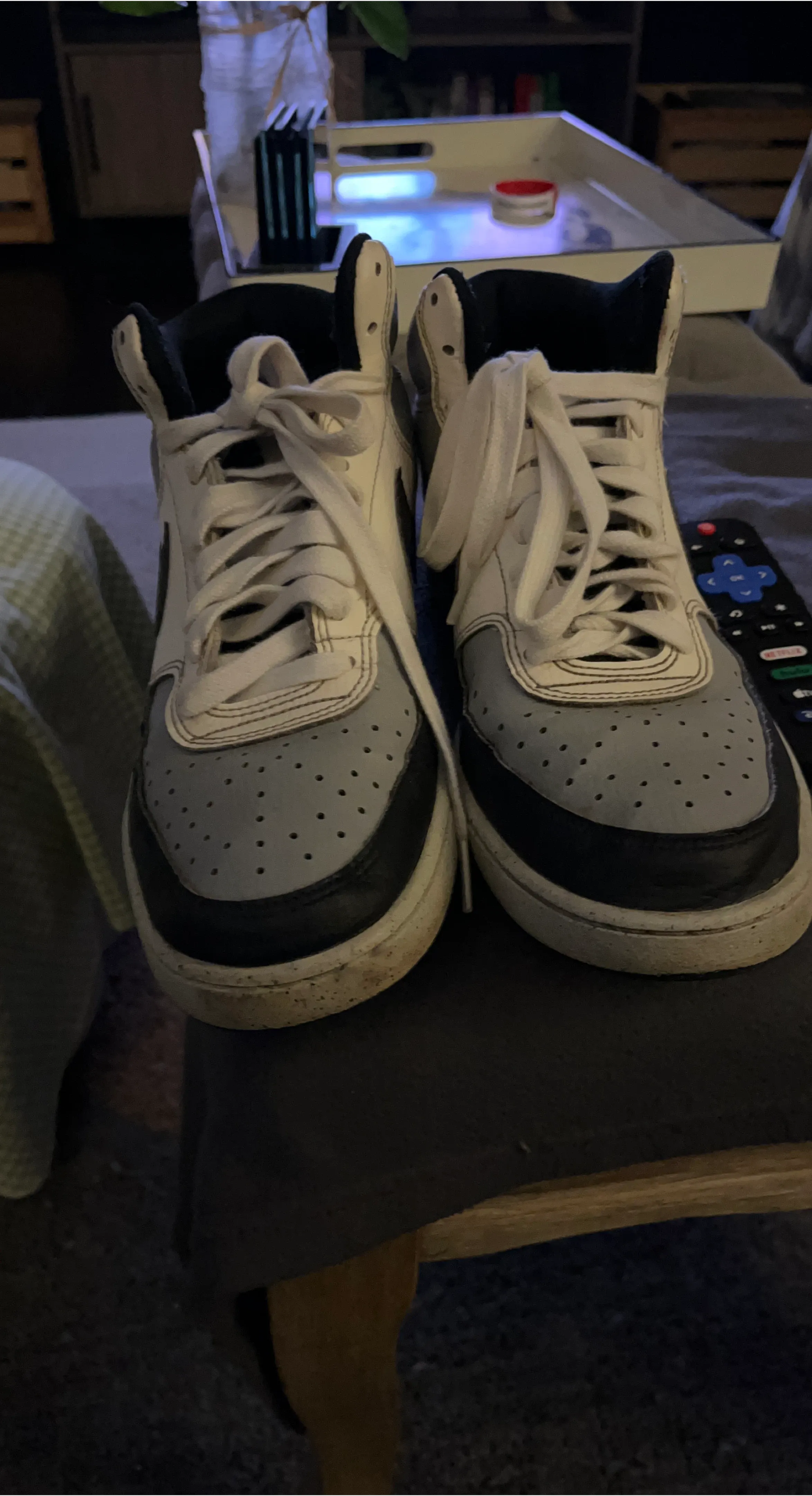 Classic Nike high-top sneakers. These feature a white and grey colorway with black accents and perforations on the toe box. They have white laces and a durable rubber sole.