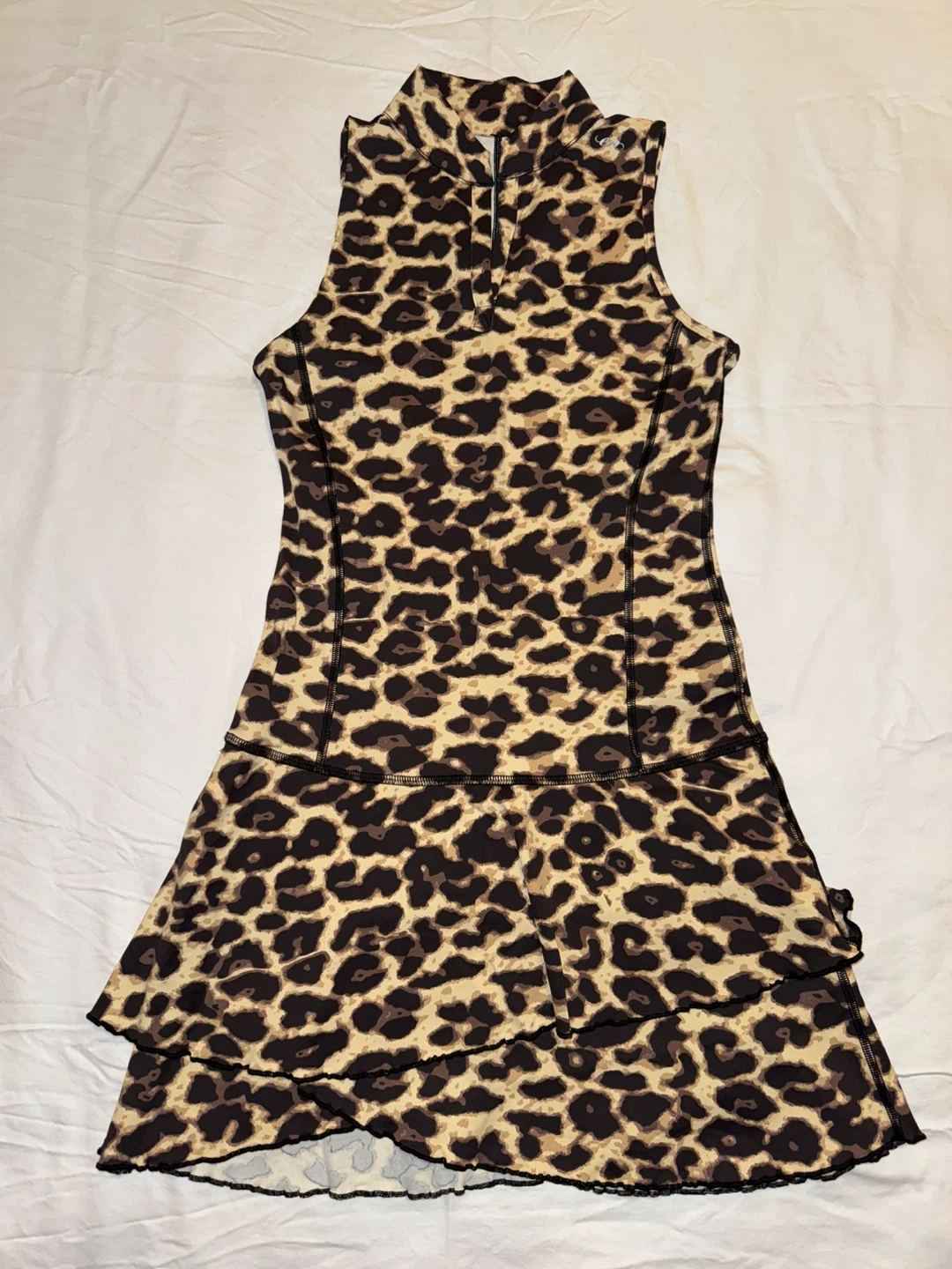Sleeveless tennis dress with a cheetah print. It features a zip-up collar and a tiered skirt. Made from a stretchy, breathable fabric.