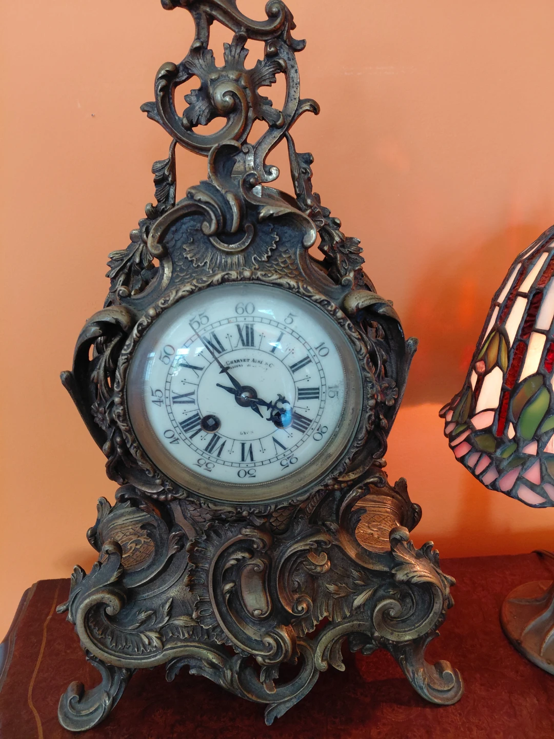 Antique Charvet Ainé & Cie mantel clock with ornate bronze casing. Features Roman numeral dial and detailed filigree. It's a beautiful decorative piece for any mantle!