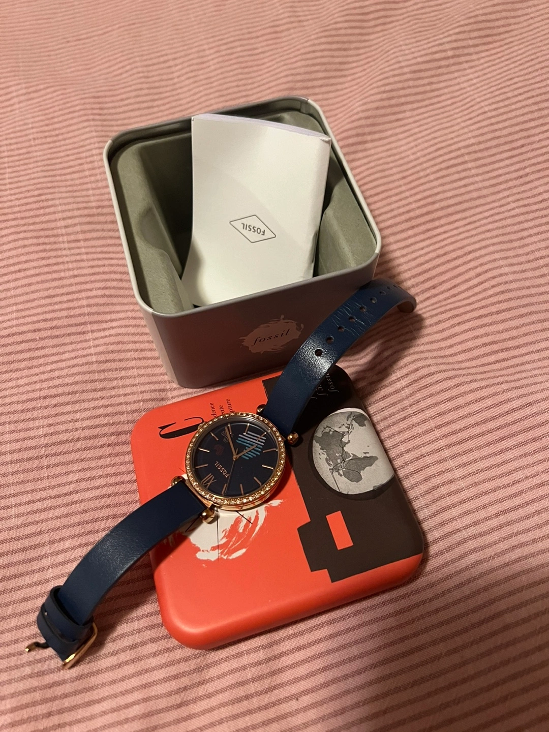 Selling a Fossil ladies' watch! It comes with its original box and looks great. If you're looking for a stylish watch, this could be the one for you