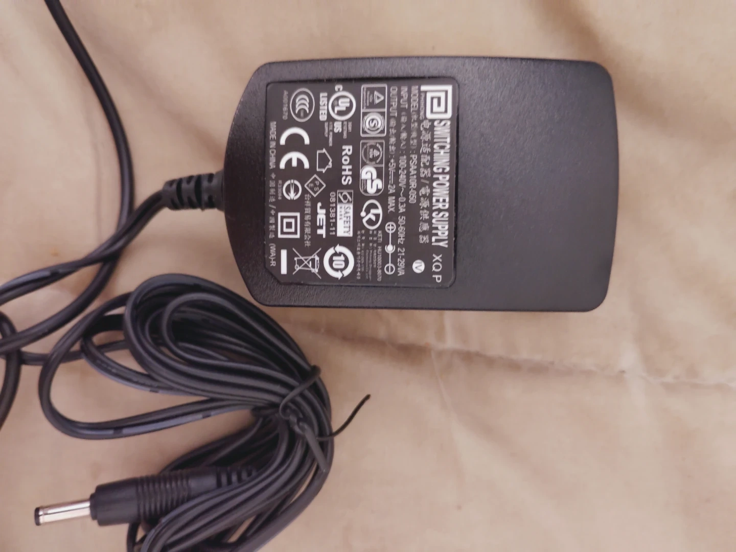 This is an XQP Switching Power Supply model PSAA10R-050. Input is 100-240V~0.3A 50-60Hz, and output is +5V-2A MAX. It's made in China.