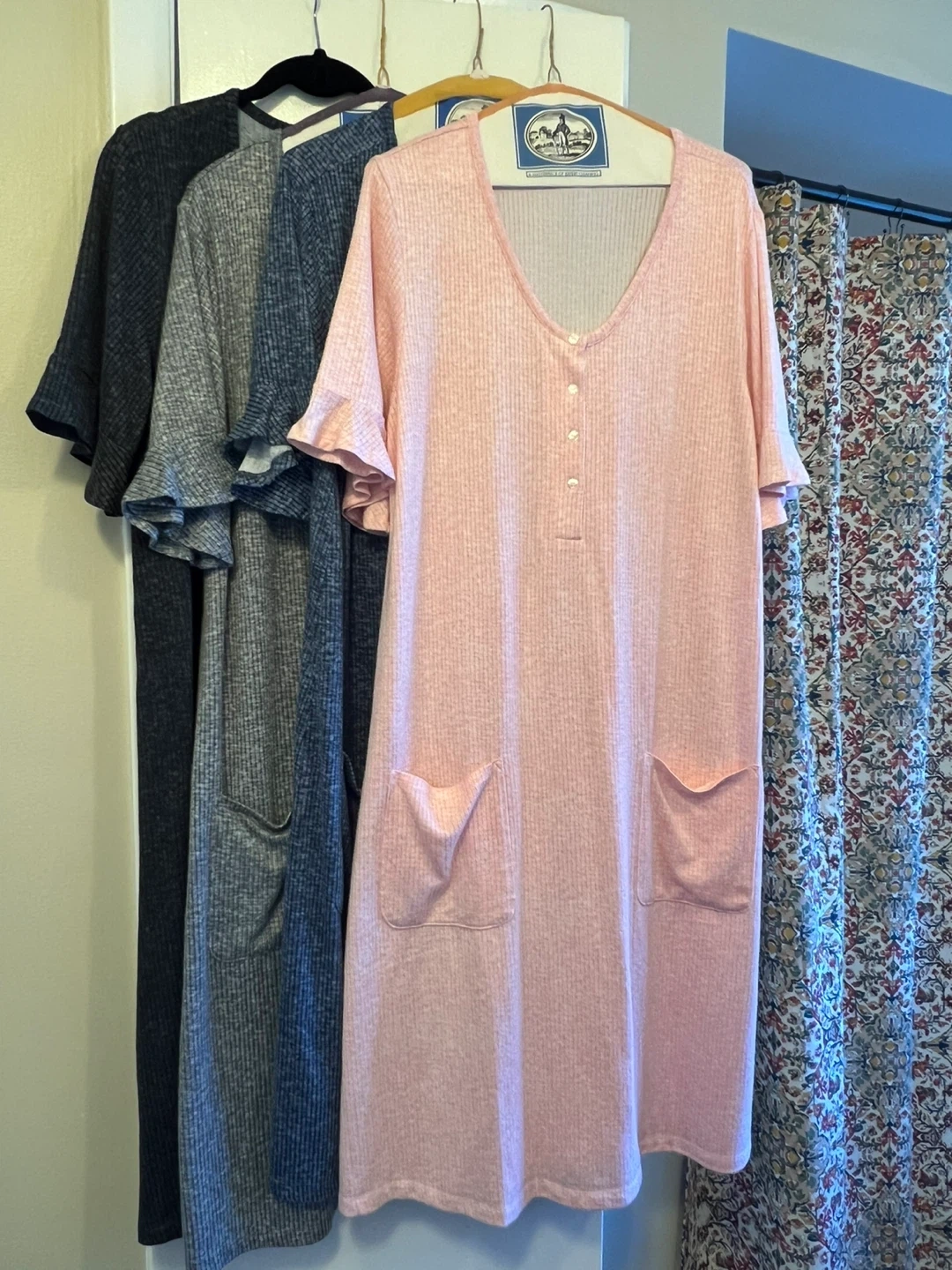 🔥 4/$20! Comfy knit house dresses with handy pockets. Perfect for lounging around the house or putting on after a shower or while getting ready to go out. Selling as a set in pink, charcoal gray, light gray & blue.