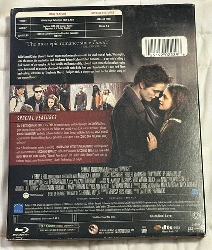 Disc 2: CONVERSATION WITH STEPHENIE MEYER, "BECOMING EDWARD" with Robert Pattinson, "BECOMING BELLA" with Kristen Stewart, and music features including "Edward's Piano Concert" and "Bella's Lullaby (Remix)" music video.