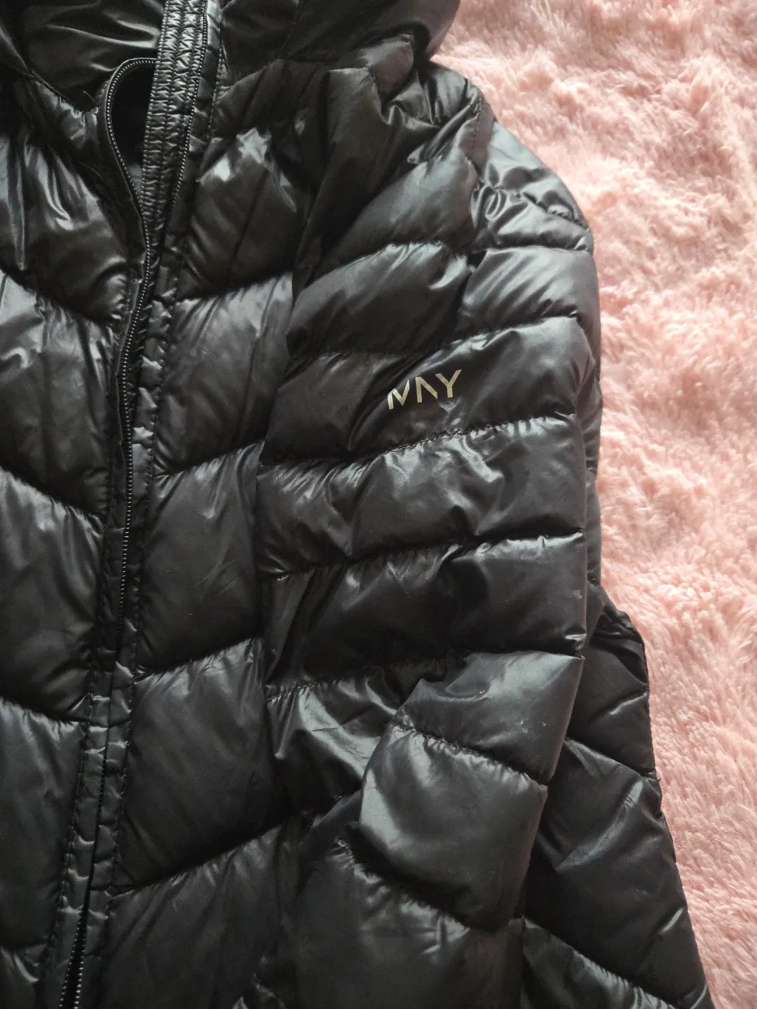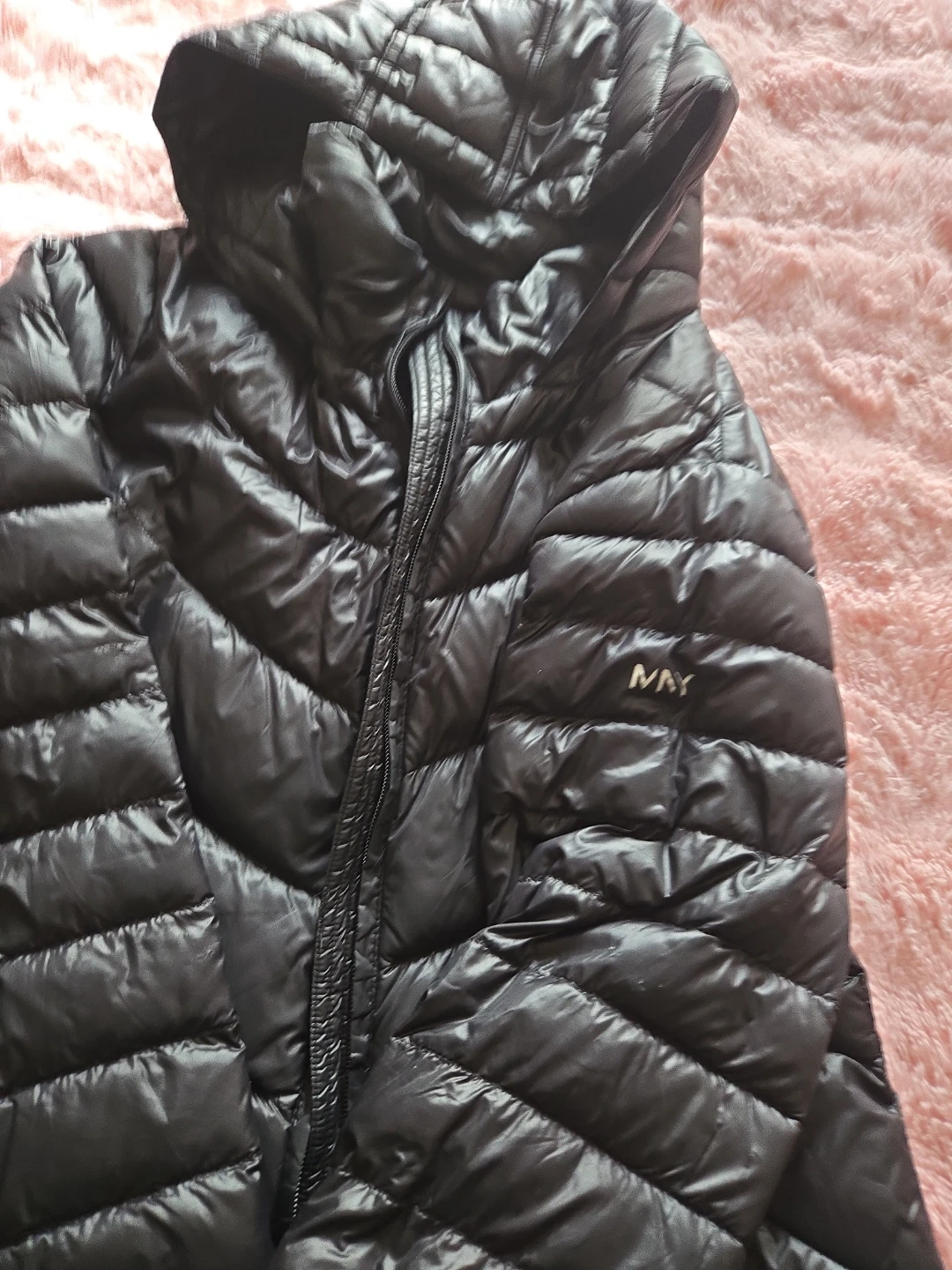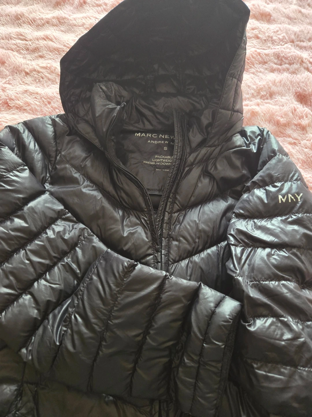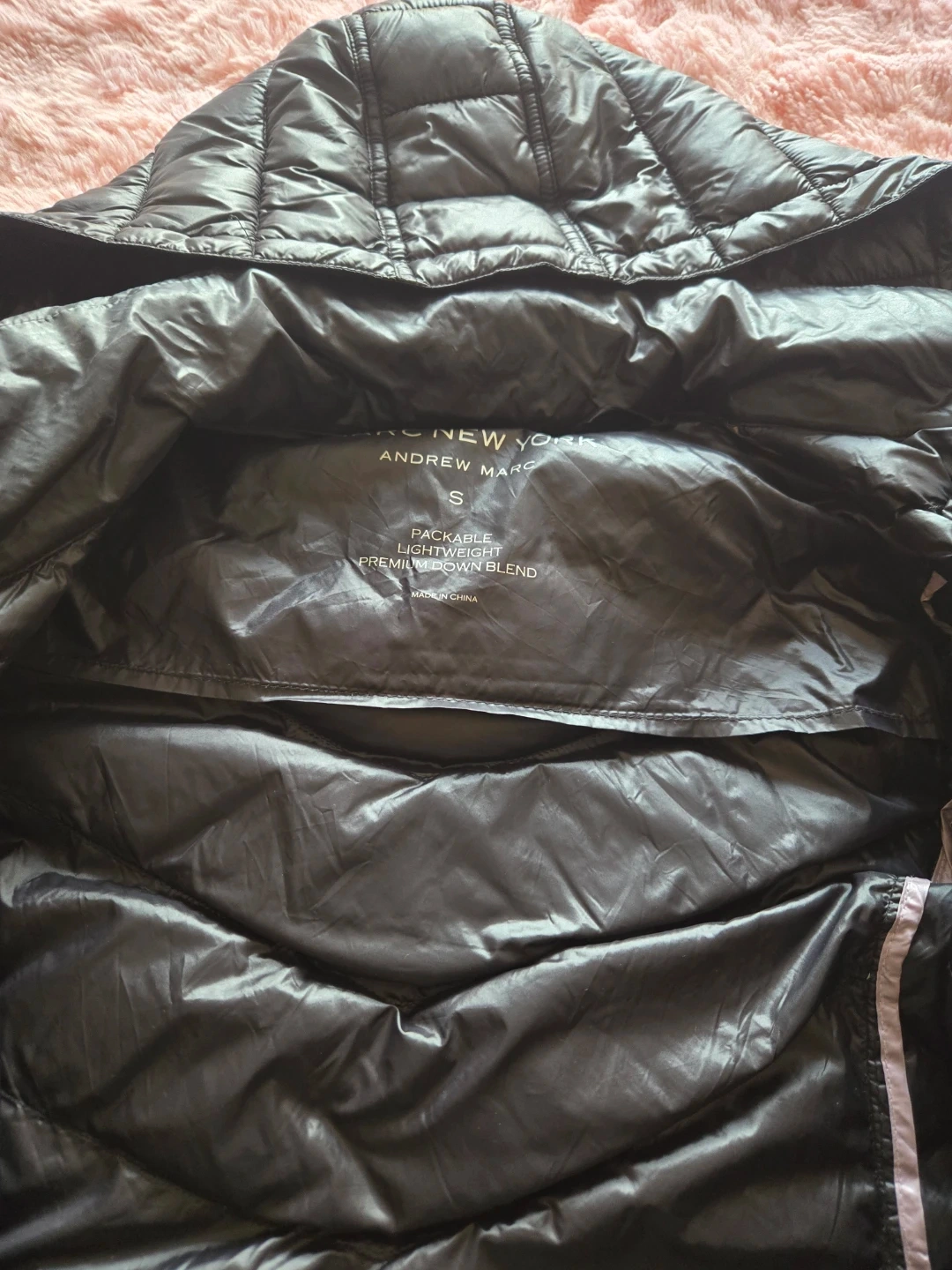 This is an Andrew Marc New York packable, lightweight down blend jacket. It's black and a size small. Made in China. This jacket is great for cool weather layering!