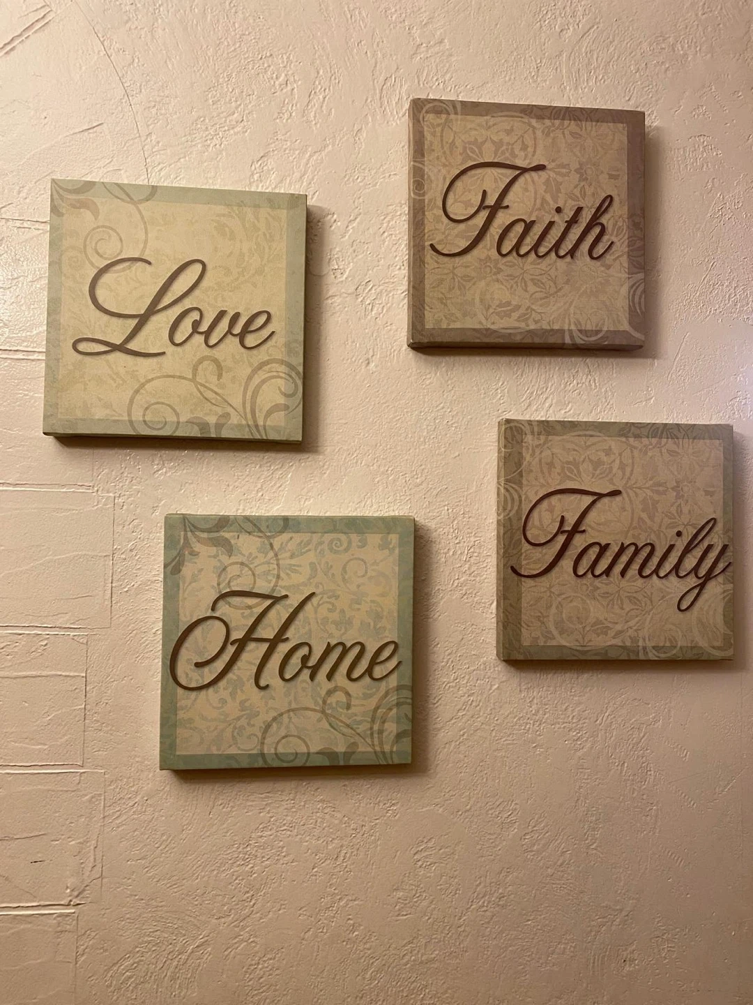 Selling a set of four decorative wall canvases. Each canvas features a different word: Love, Faith, Home, and Family. They're perfect for adding a warm touch to any room