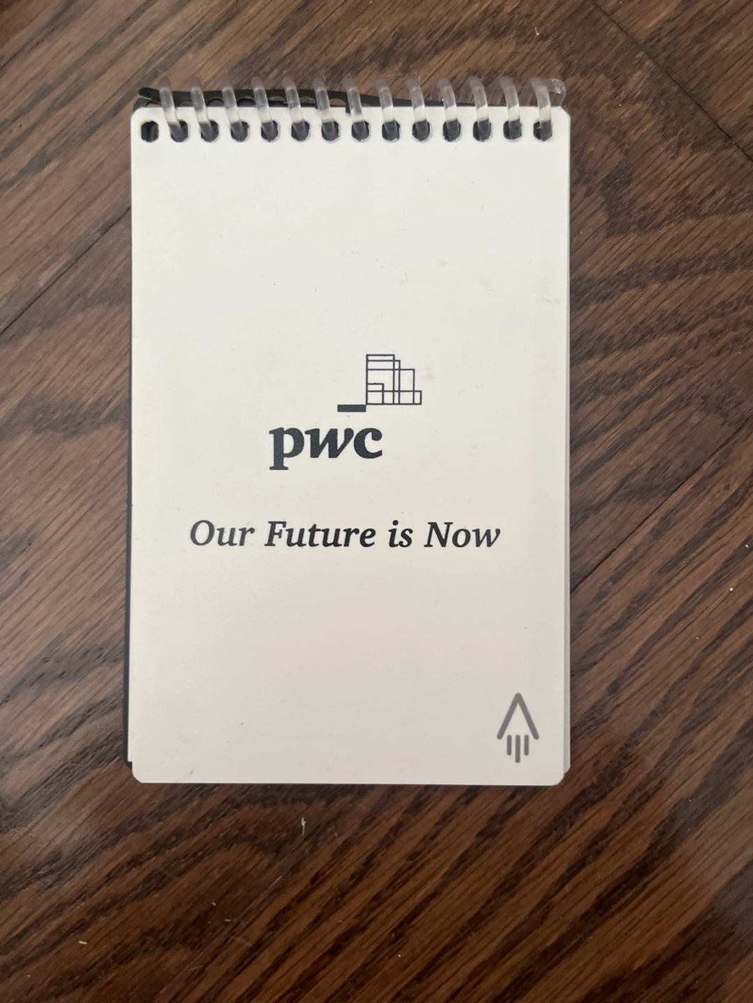 Reusable notebook. Small size, spiral bound. White pages with dot grid. Includes a QR code. Branded for PwC. 'Our Future is Now' on cover.