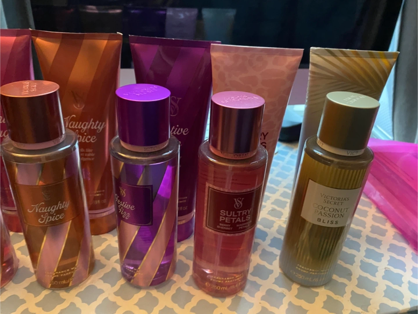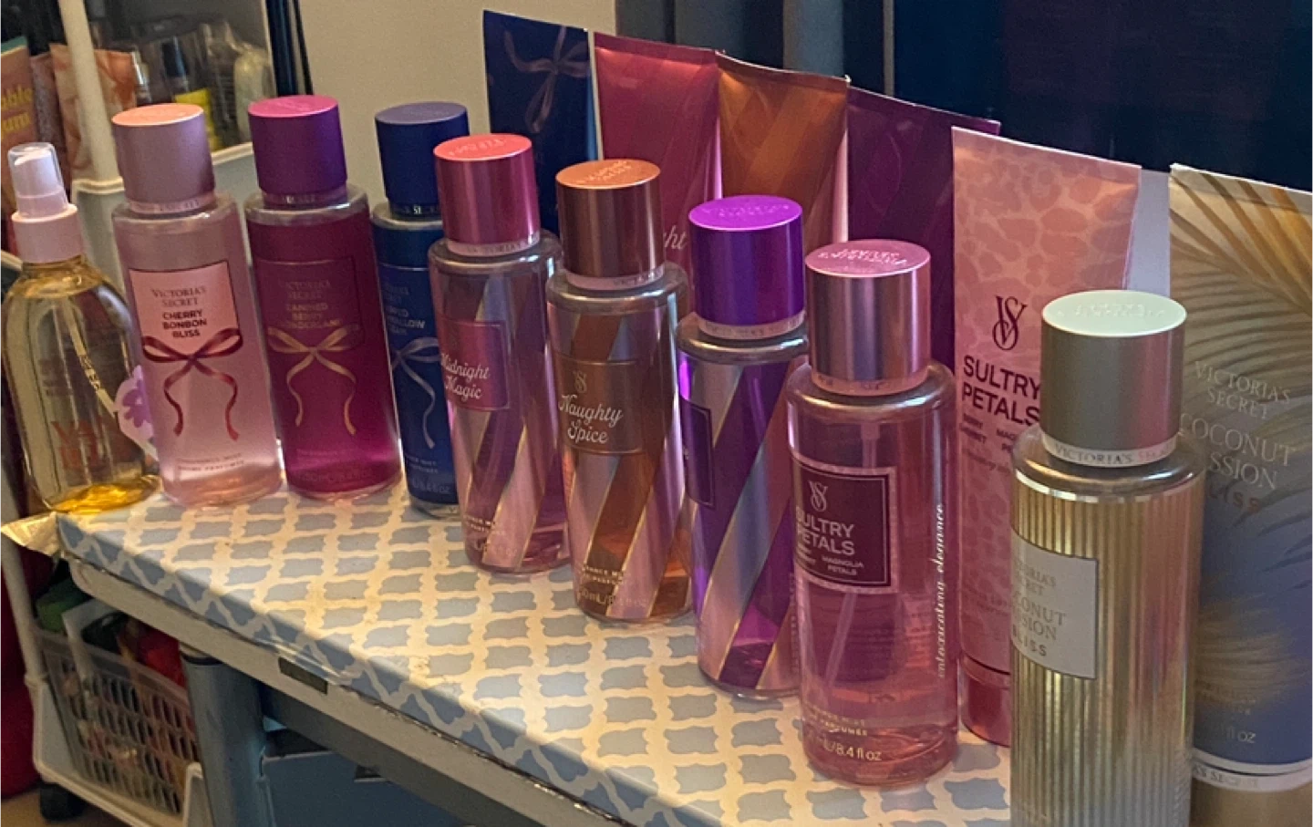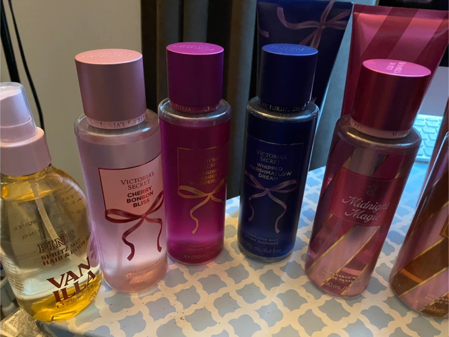 Selling a variety of Victoria's Secret body mists! Scents include Naughty Spice, Festive Fizz, Sultry Petals, Coconut Passion Bliss, Cherry Blossom Bliss, Candied Berry Wonder, Whipped Marshmallow Dream, and Midnight Magic. Each bottle contains 250 mL / 8.4 fl oz