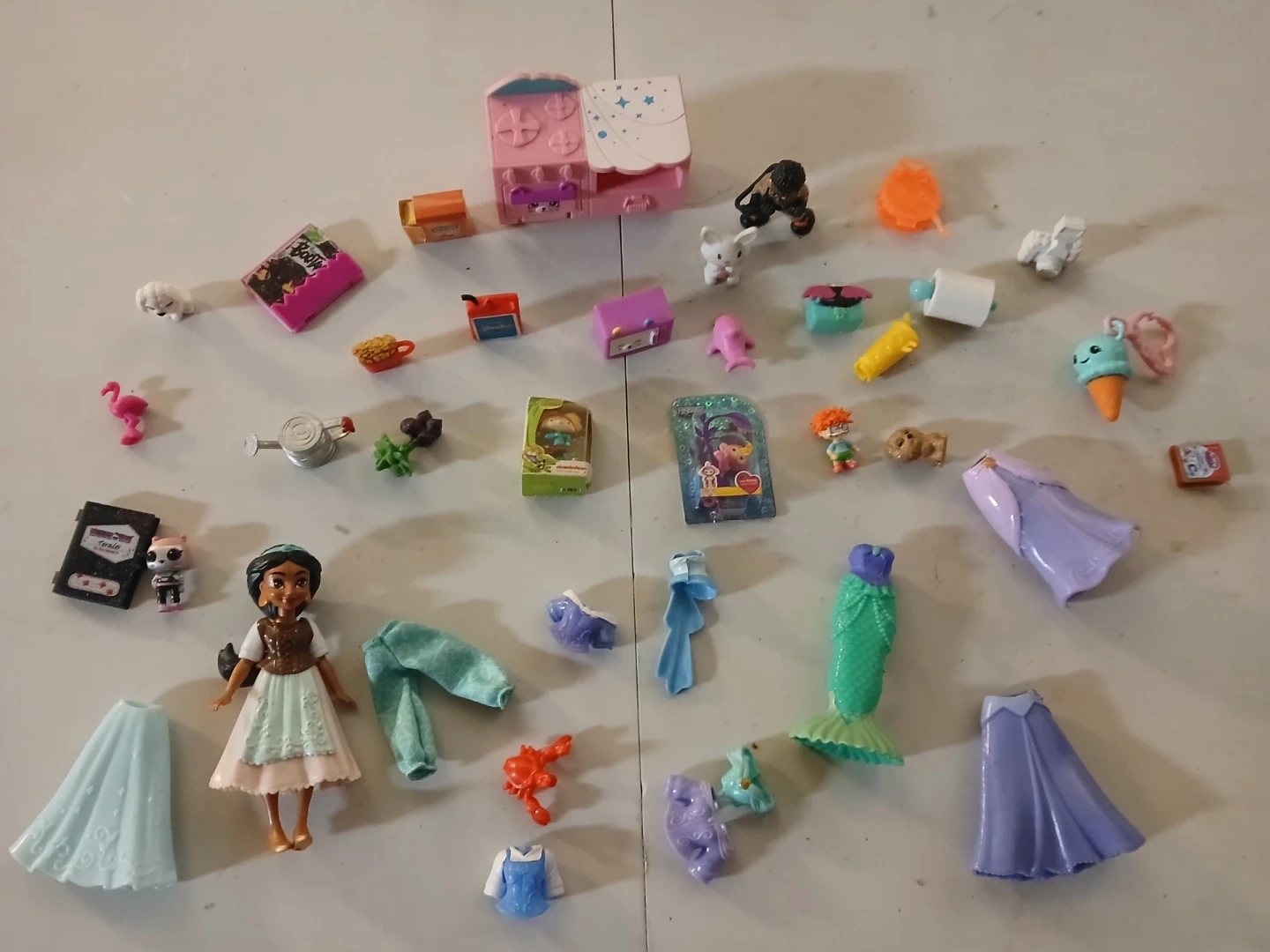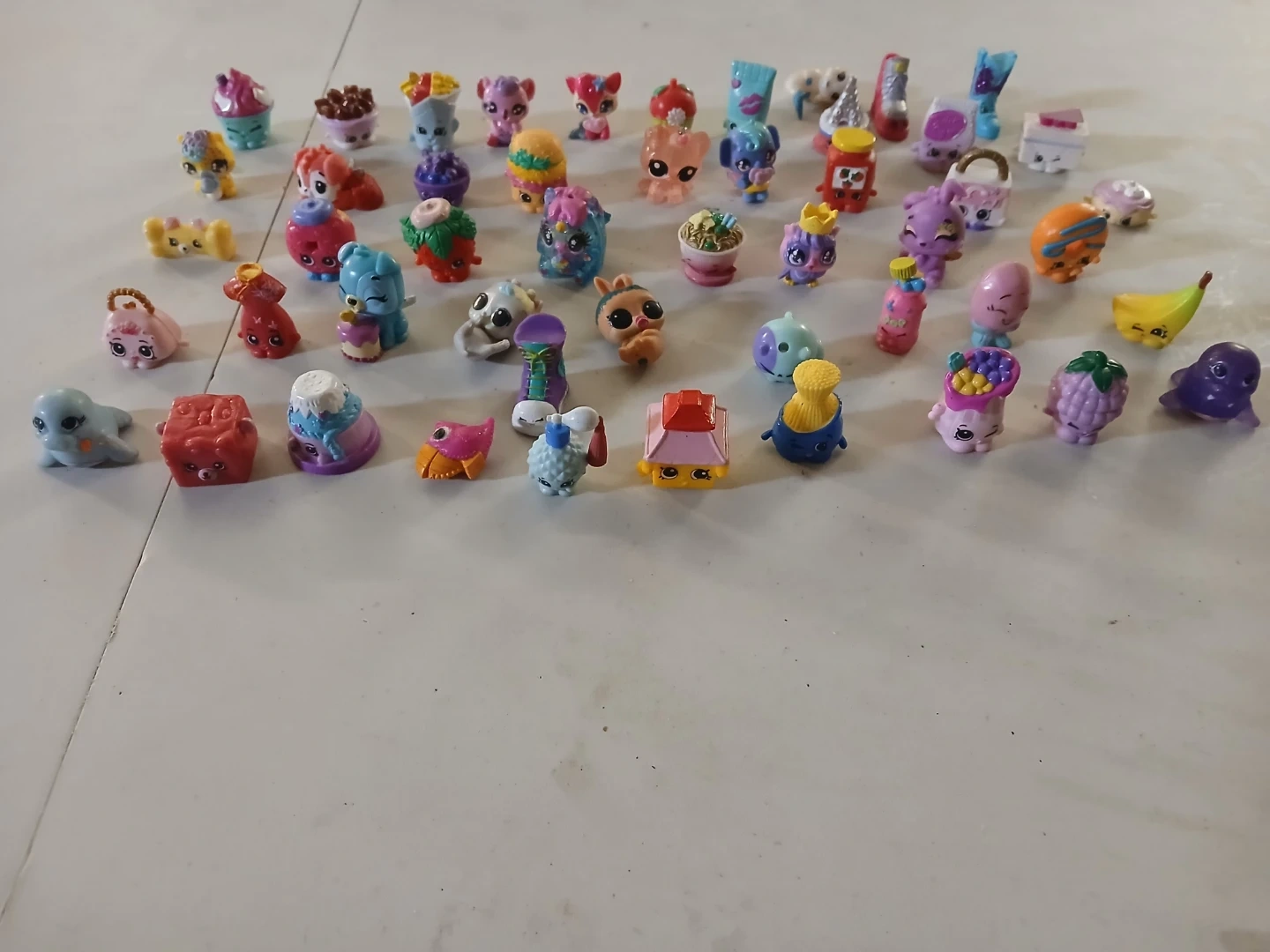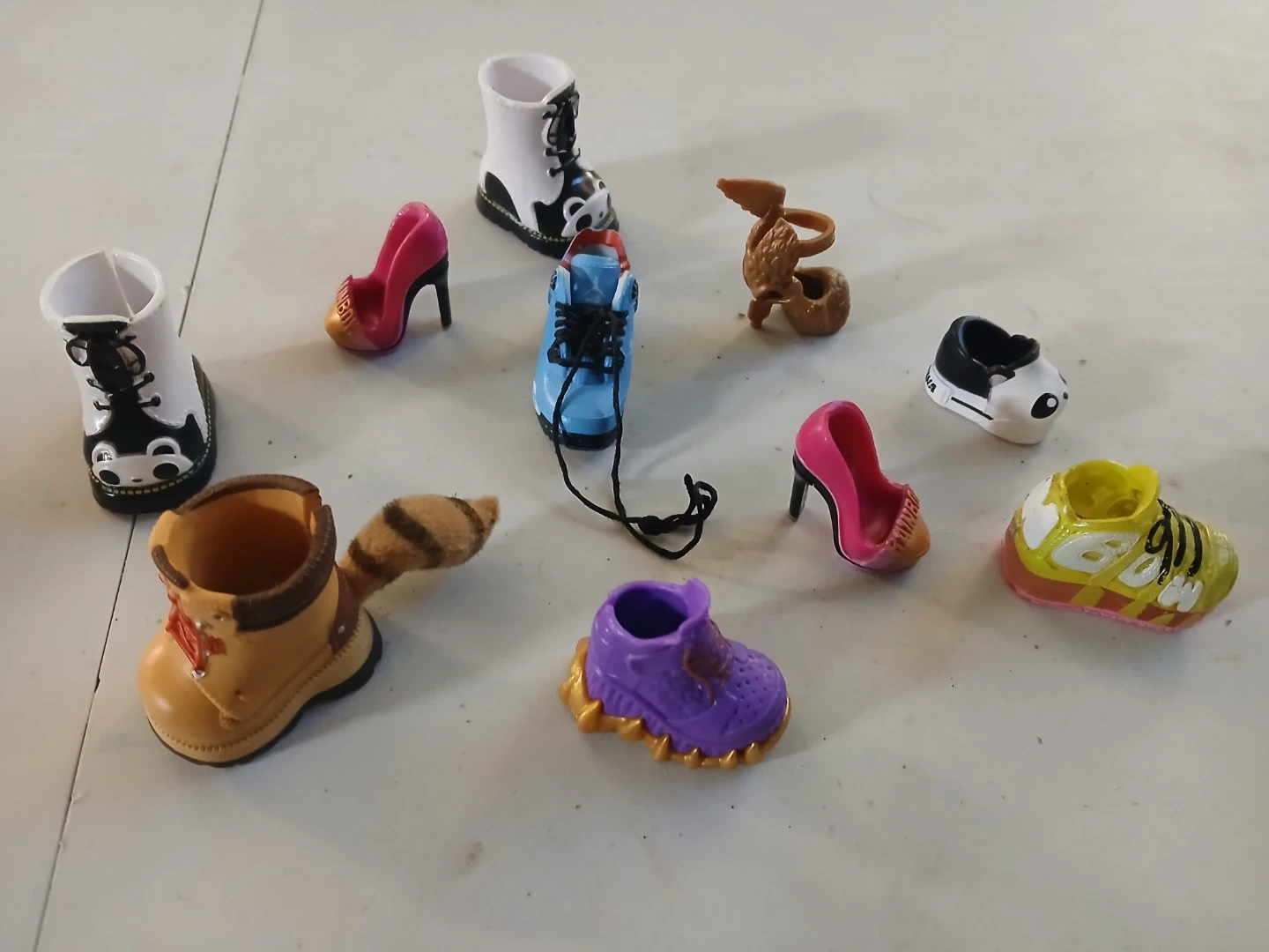 This collection includes a variety of miniature shoes and accessories, along with many small character figures and animal toys. Items vary in style and size, perfect for imaginative play.