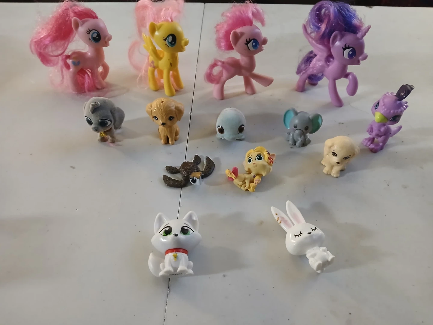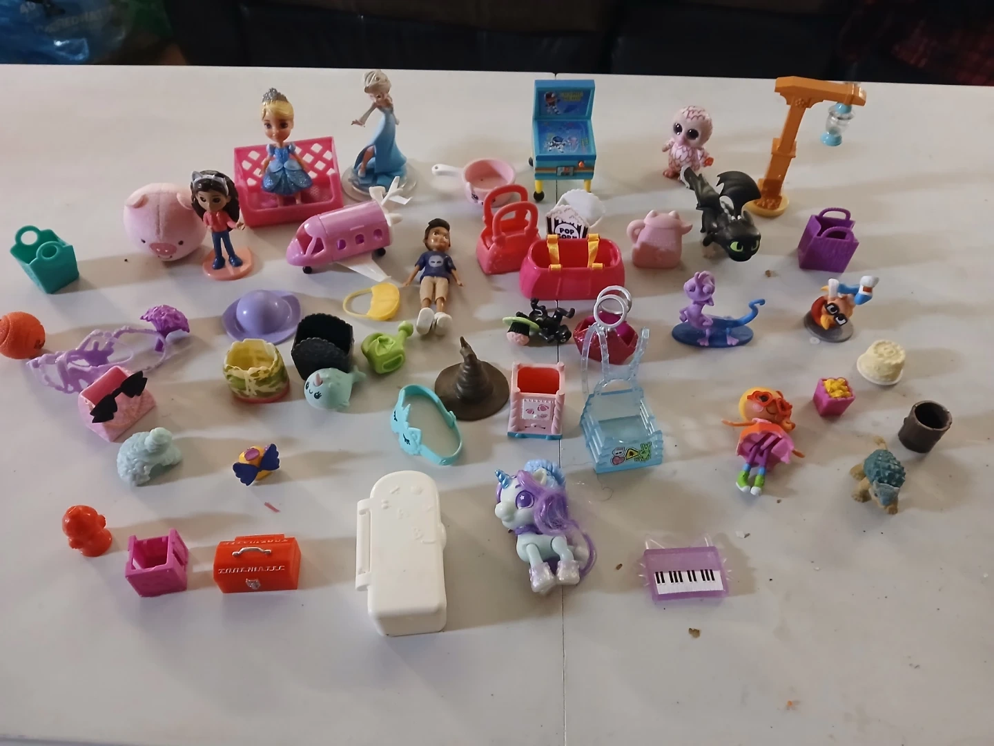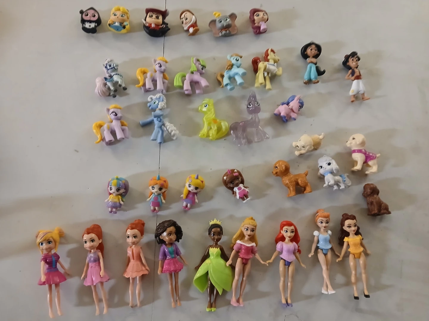 This collection includes a variety of miniature shoes and accessories, along with many small character figures and animal toys. Items vary in style and size, perfect for imaginative play.