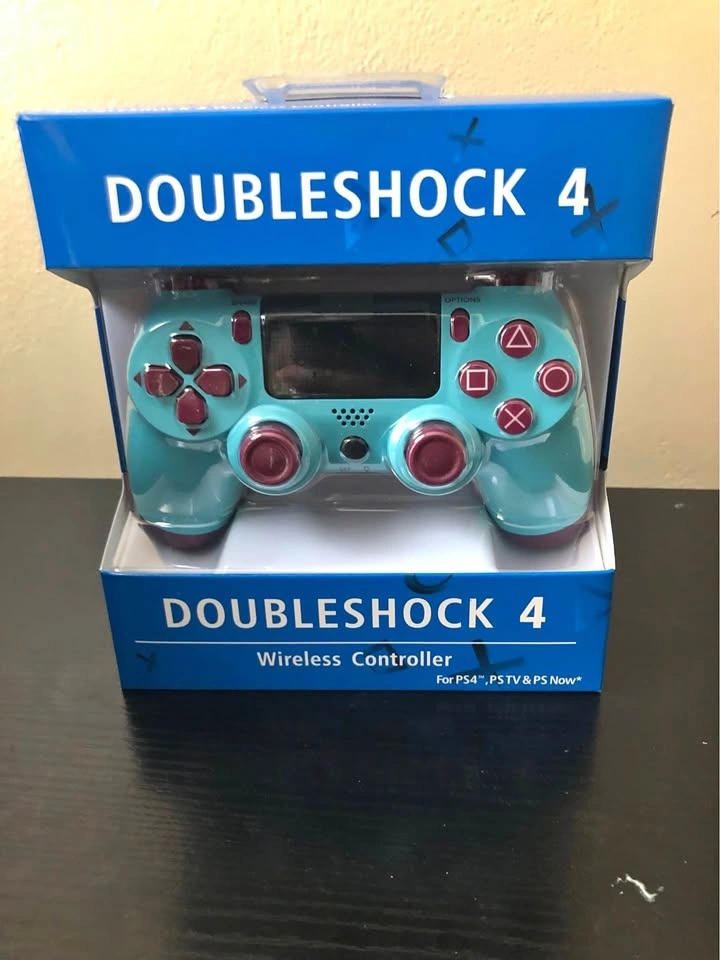 Colorful DualShock 4 wireless controller. Super cool aqua blue with maroon buttons and joysticks. Works with PS4, PS TV, and PS Now. Still in box, never opened.